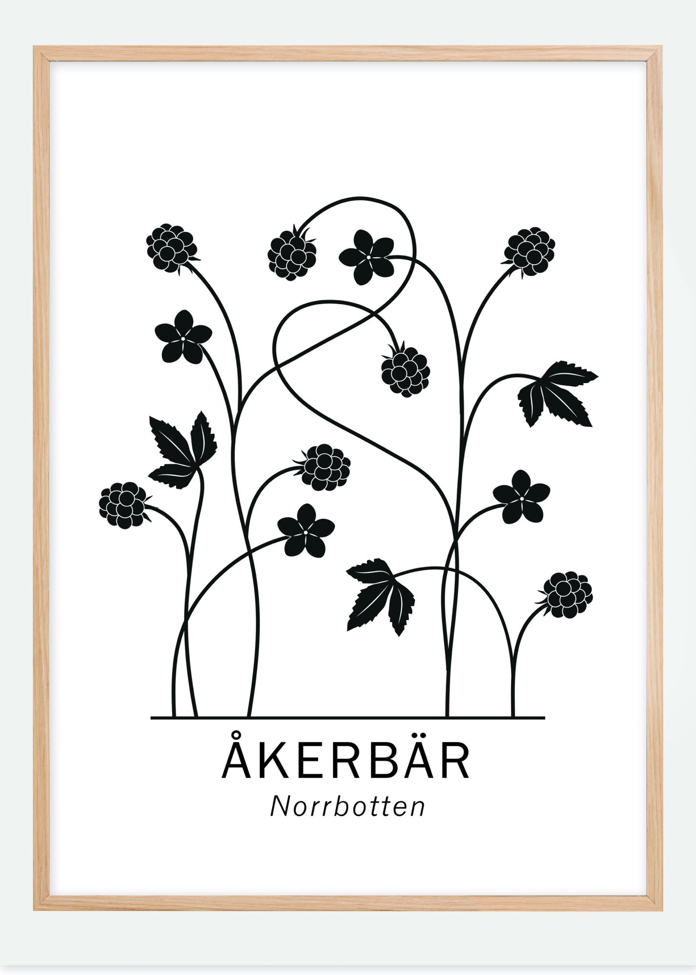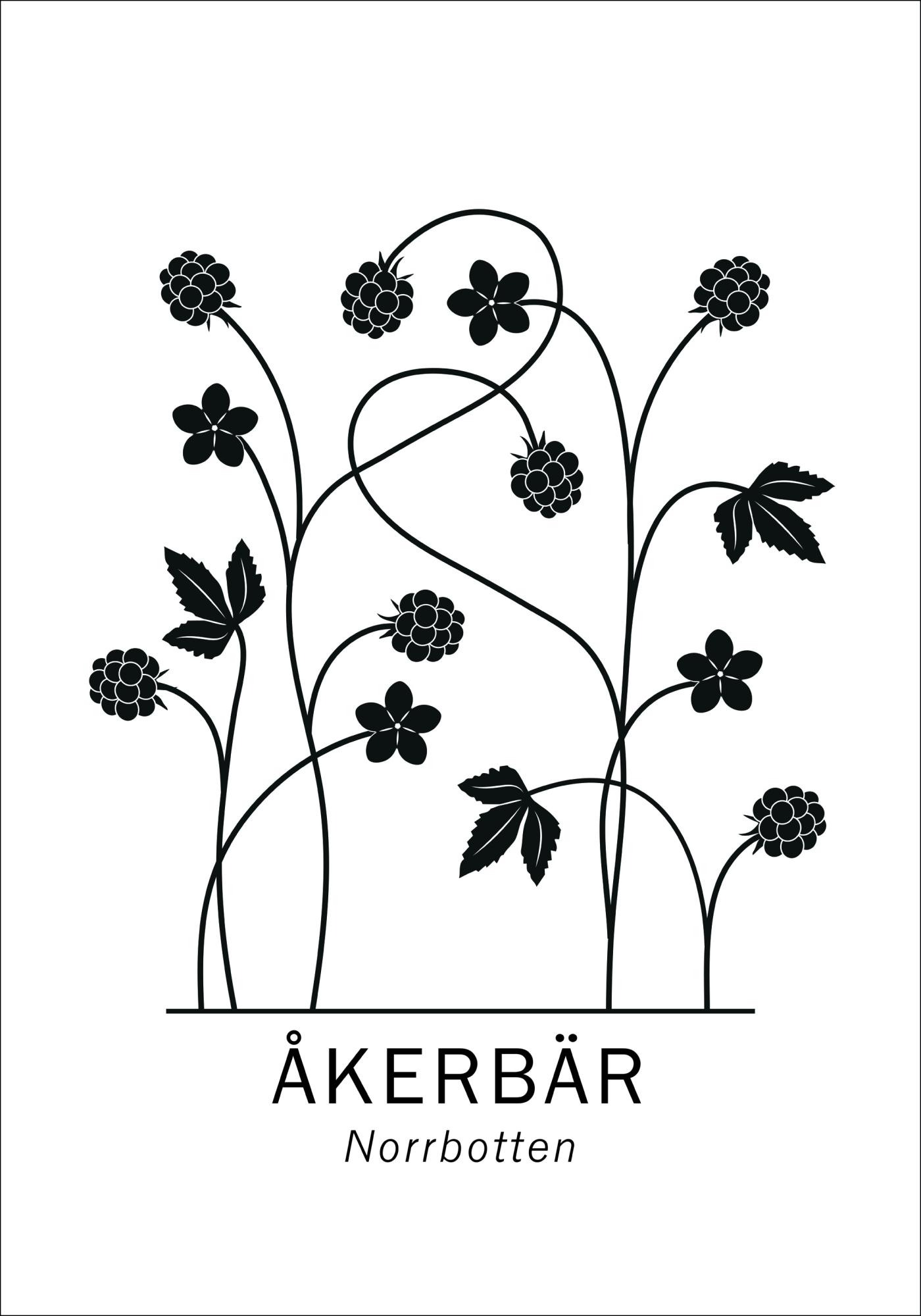 Stiliziran plakat z jagodami v črnem tisku. Več stiliziranih cvetov in listov jagod valovi okoli v tem preprostem črno-belem tisku. Besede Åkerbär Norrbotten so na dnu slike, ki bi se lepo prilegala na pisano steno, da bi ji dodala še več življenja.