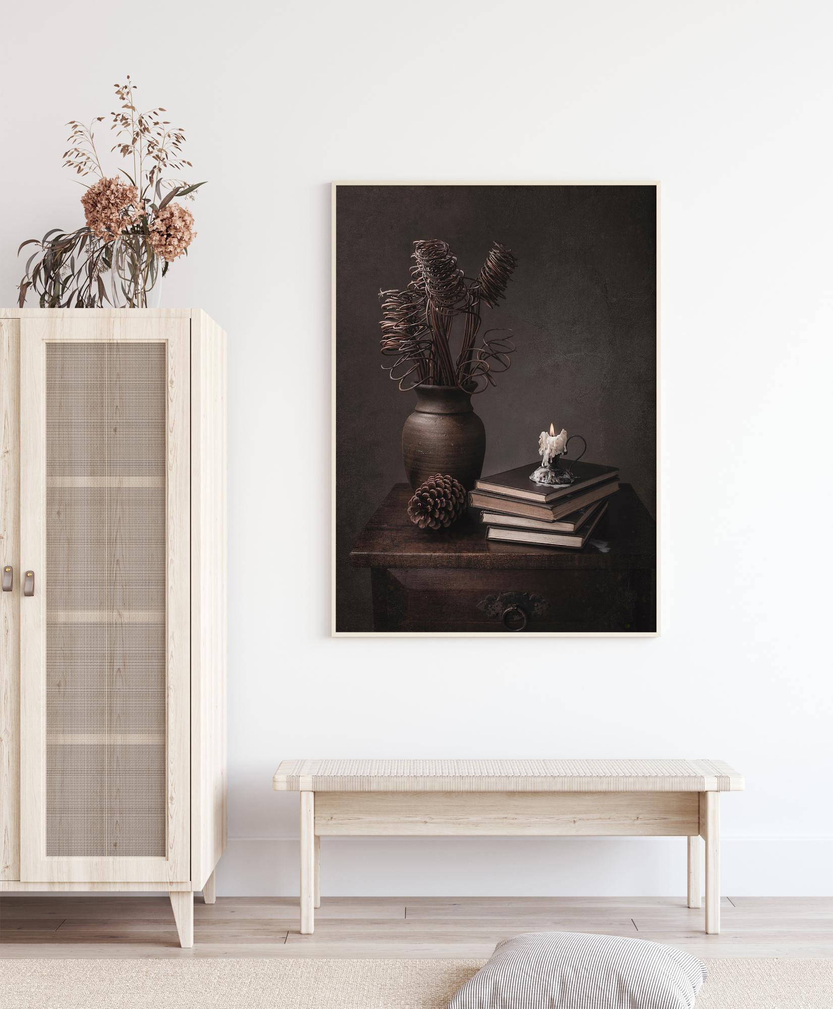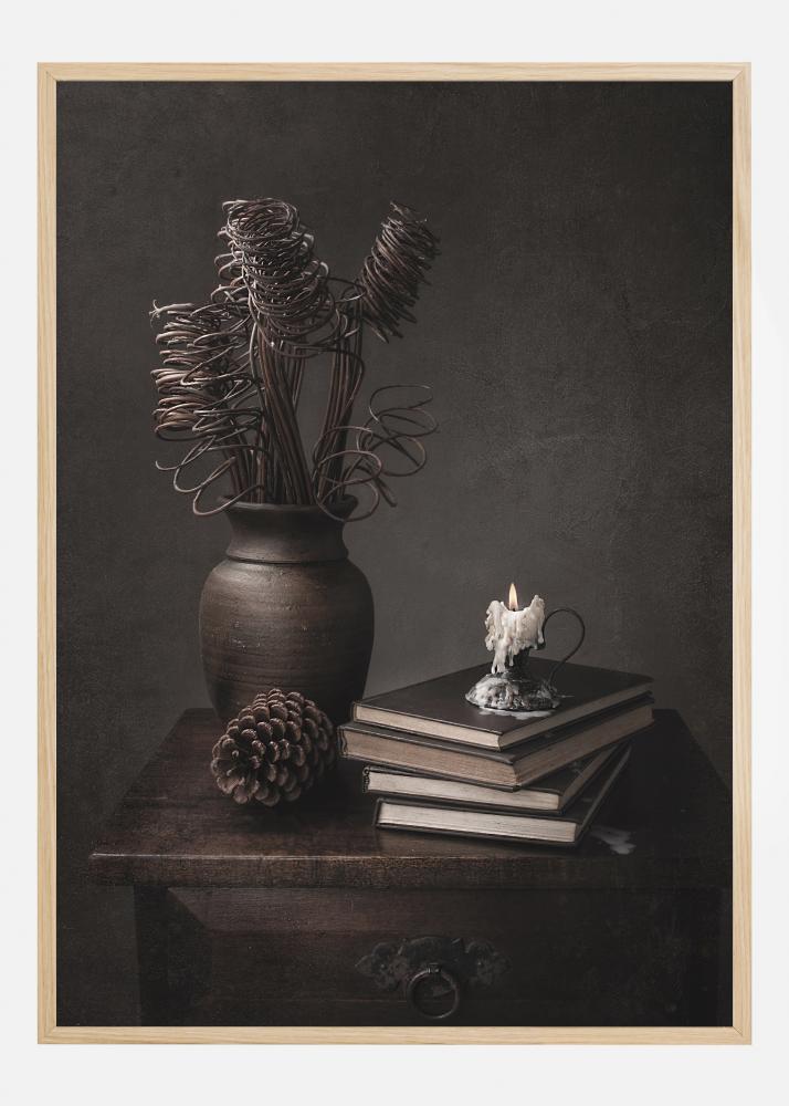 Dramatična tihožitna slika s vrčem, storžem, knjigami in svečo na stari komodi. Spirale suhe rastline pritegnejo pogled na taljenje voska in plamen sveče. Temni sepija odtenki dajejo skrivnosten občutek časa iz preteklosti.