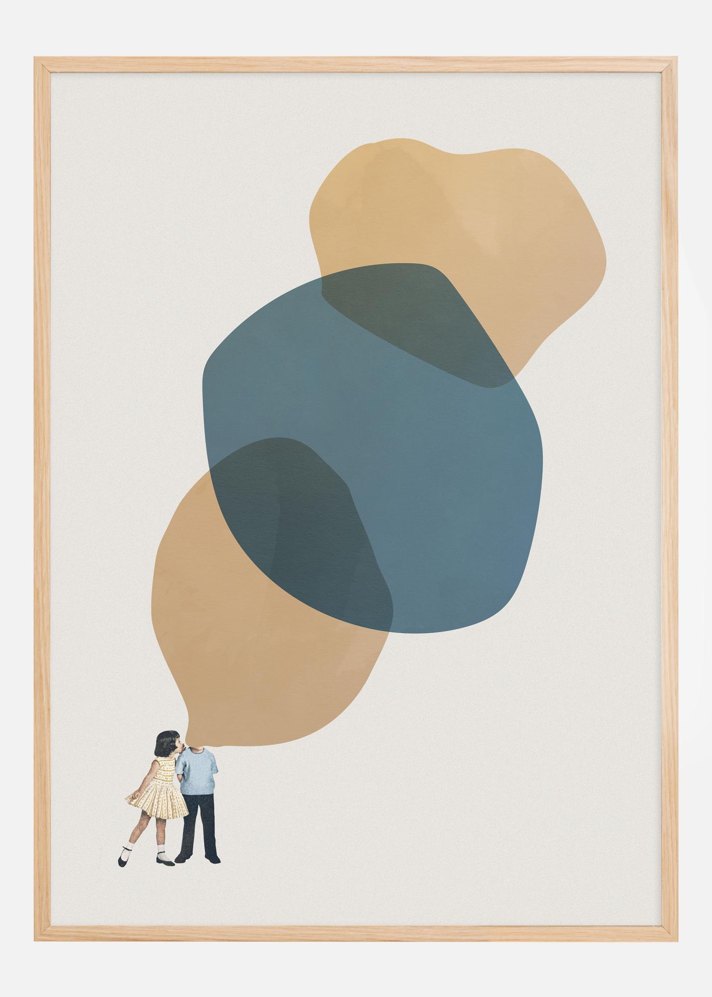 Ta prefinjena poster ujame intimni trenutek med dvema otrokoma, ki stojita blizu drug drugega in si delita šepet. Motiv prikazuje figuri otrok, ki sta obdani z mehkimi in prekrivajočimi se abstraktnimi oblikami, ki ustvarjajo občutek toplega objema okrog para. Zaupna interakcija otrok je upodobljena z nežnostjo, ki vzbuja spomine na otroške skrivne igre in tiha dogovore. Ta print vabi v svet miru in skrivnosti in postane očarljiva zgodba za steno v vseh vrstah prostorov.