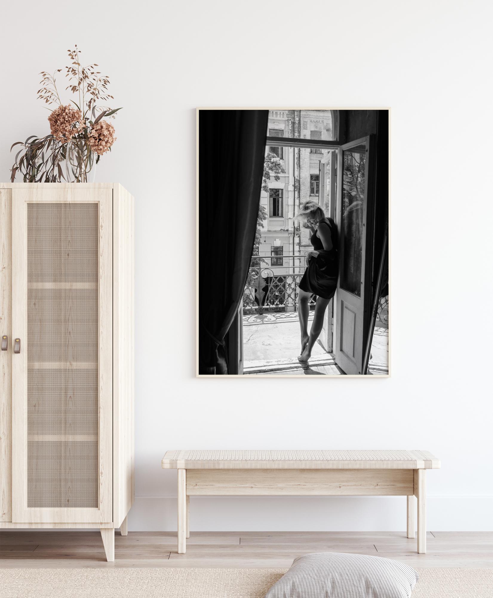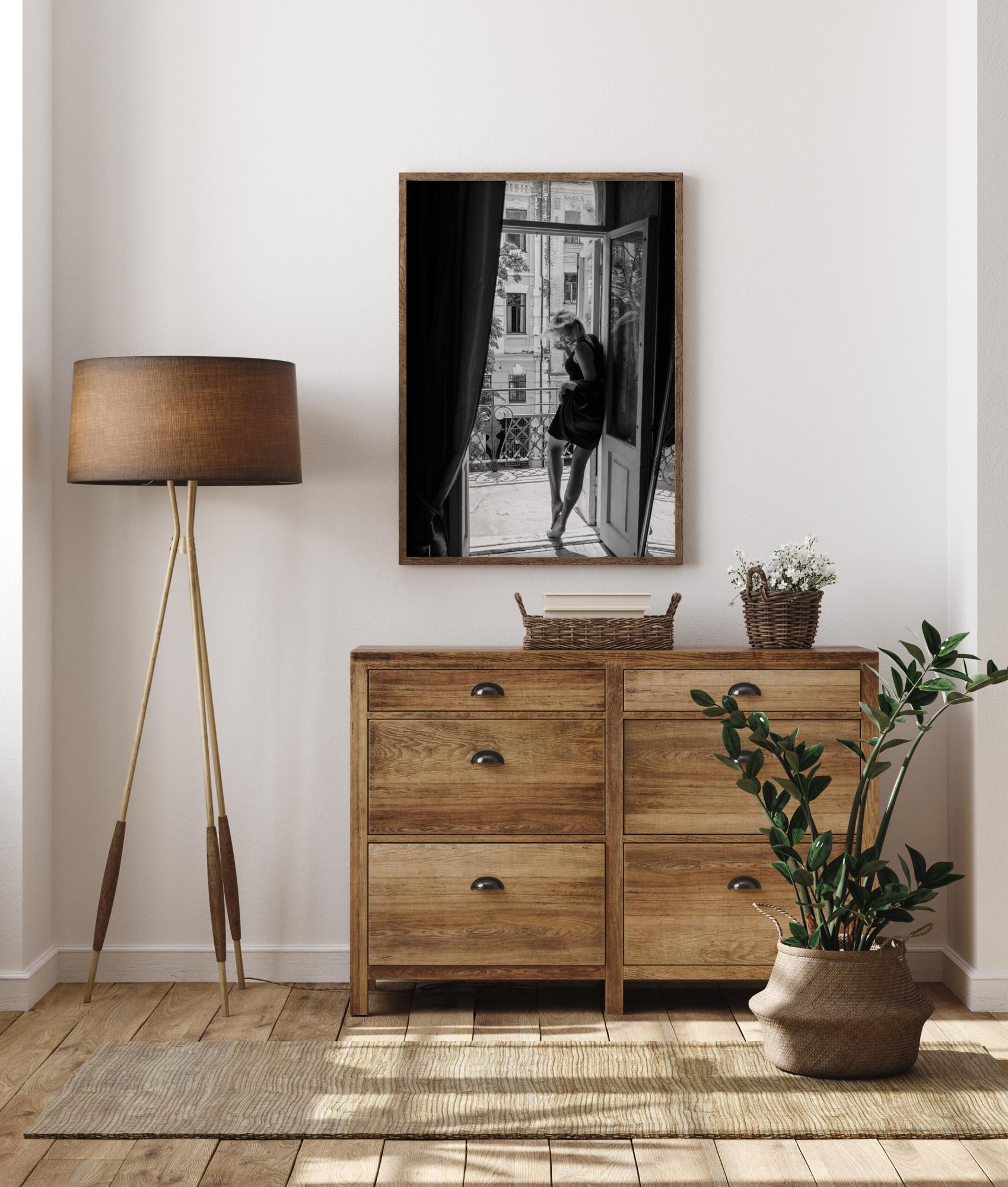 Klasičen poster z žensko na balkonu v Parizu. Ženska nosi črno obleko, ki podaljšuje njene gole noge, ko se naslanja na vrata, stoji na prstih in gleda v svoja stopala. Kombinirajte ta črno-beli poster s svetlo obarvano steno, da dodate pridih elegance.