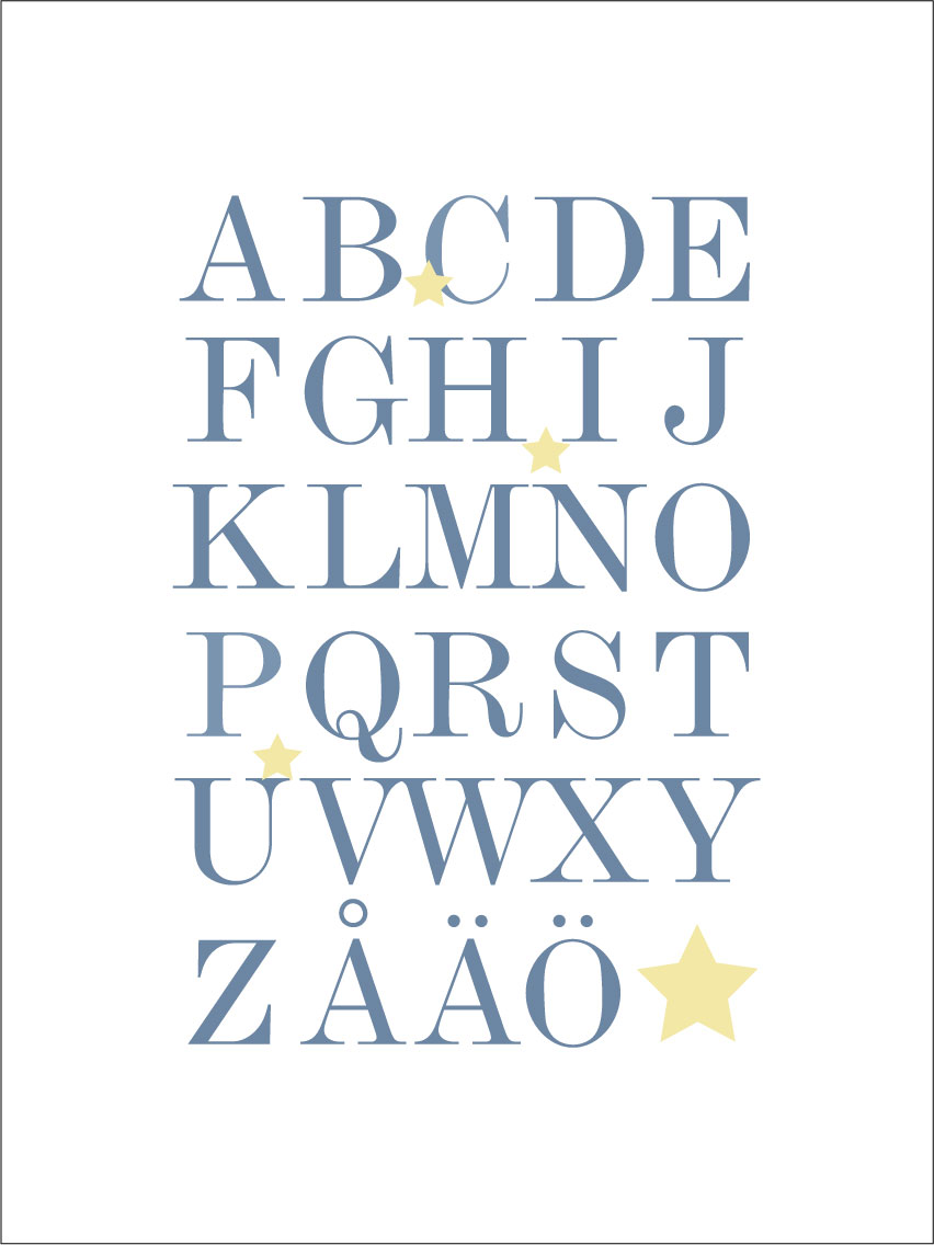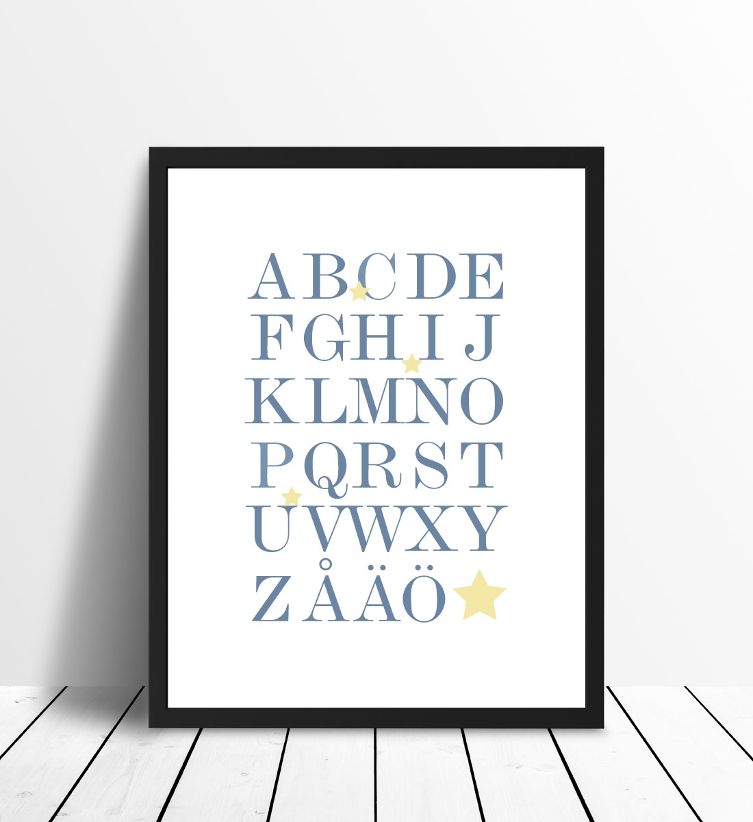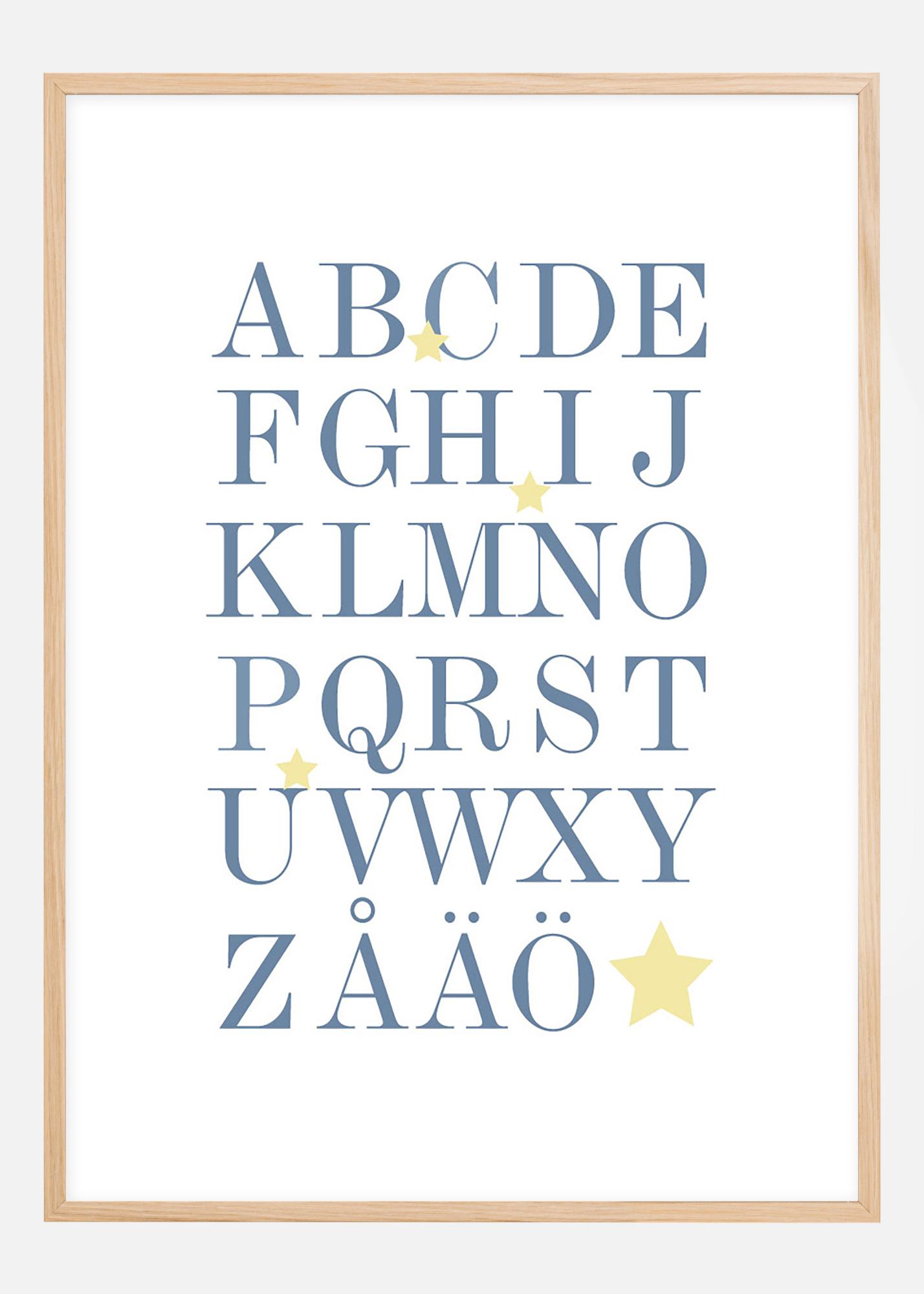 Plakat s celotno abecedo, A-Ö, v modri barvi in zvezdami v bež barvi. Pedagoški motiv se lepo poda v otroško sobo za vadbo abecede, pa tudi na druge stene v domu. Elegantni izraz omogoča, da plakat ustreza vsem stilom notranje opreme in vrstam domov. Kombinirajte ga z drugimi slikami v steno s temo ali okrasite steno skupaj s plakatom s številkami 1-10.