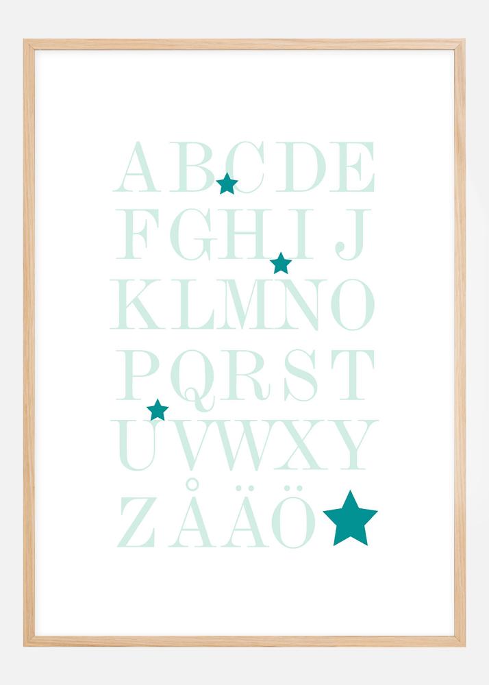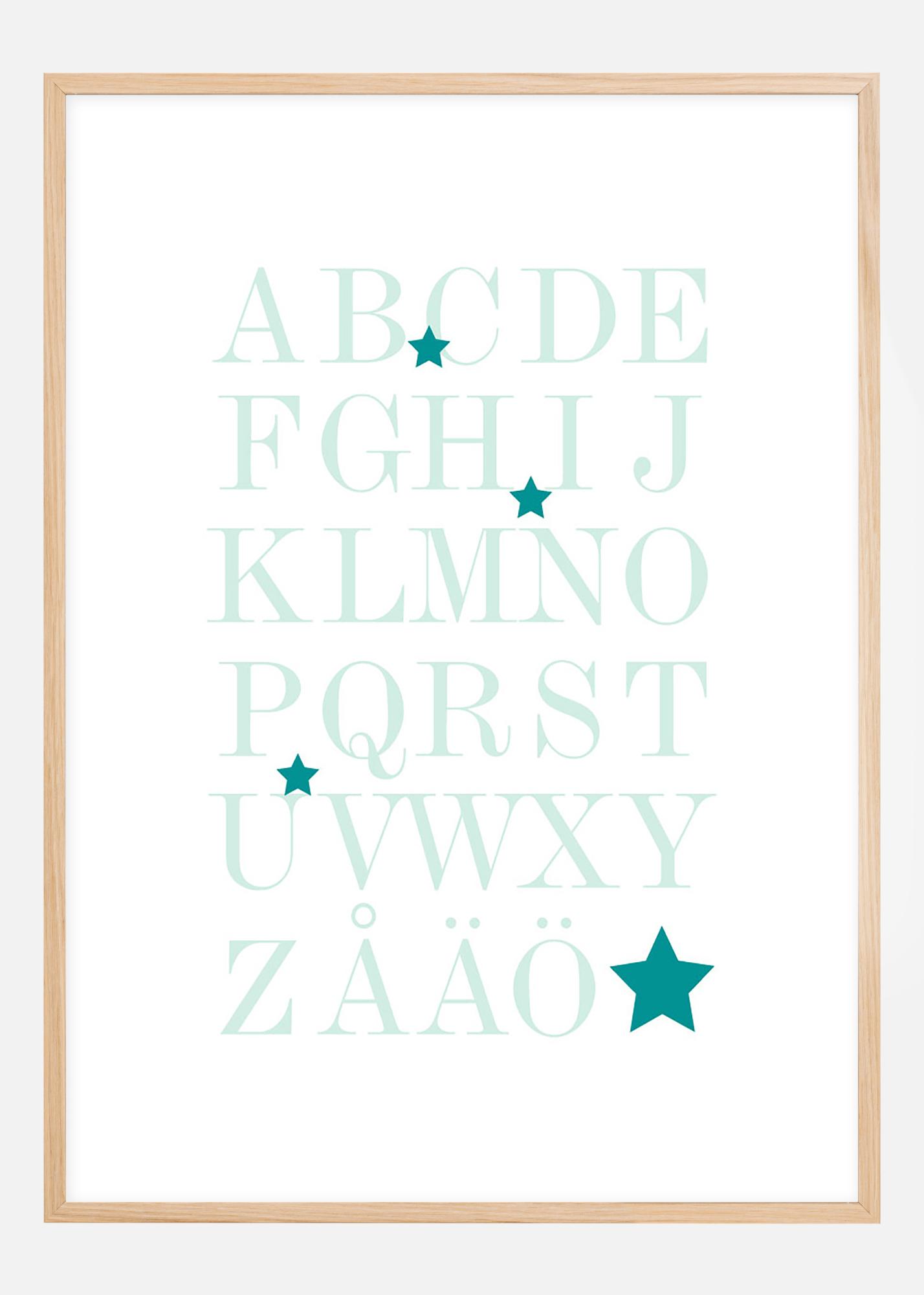Grafični tisk z celotno abecedo, A-Ö, v morsko zeleno-turkiznih odtenkih. Pedagoški motiv se odlično prilega otroški sobi za vadbo abecede, ampak prav tako tudi na drugih stenah doma. Njegov eleganten videz omogoča, da se plakat prilega v vse sloge notranje opreme in tipe domov. Kombinirajte ga z drugimi slikami za stensko galerijo s temo ali okrasite steno skupaj s plakatom s številkami od 1 do 10.