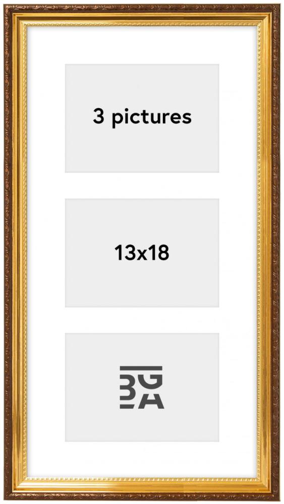 S tem kolažnim okvirom lahko okrasiš svojo steno s fotografijami družine, prijateljev in spomini iz čudovitih trenutkov v življenju. Okvir ima prostor za 3 fotografije velikosti 13x18 cm. Okvir v zlati barvi ima čudovit retro slog z dekorativnim zunanjim robom v toplem rjavem odtenku. Priloženo je tudi stensko držalo.