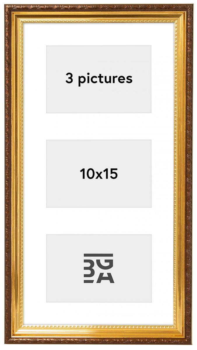 S tovrstnim okvirjem za kolaž lahko okrasite svojo steno s fotografijami družine, prijateljev in spomini na čudovite trenutke v življenju. Okvir ima prostor za 3 slike velikosti 10x15 cm. Zlato obarvan okvir ima čudovit retro stil z dekorativnim zunanjim robom v topli rjavi odtenki. Stenski nosilec je vključen.