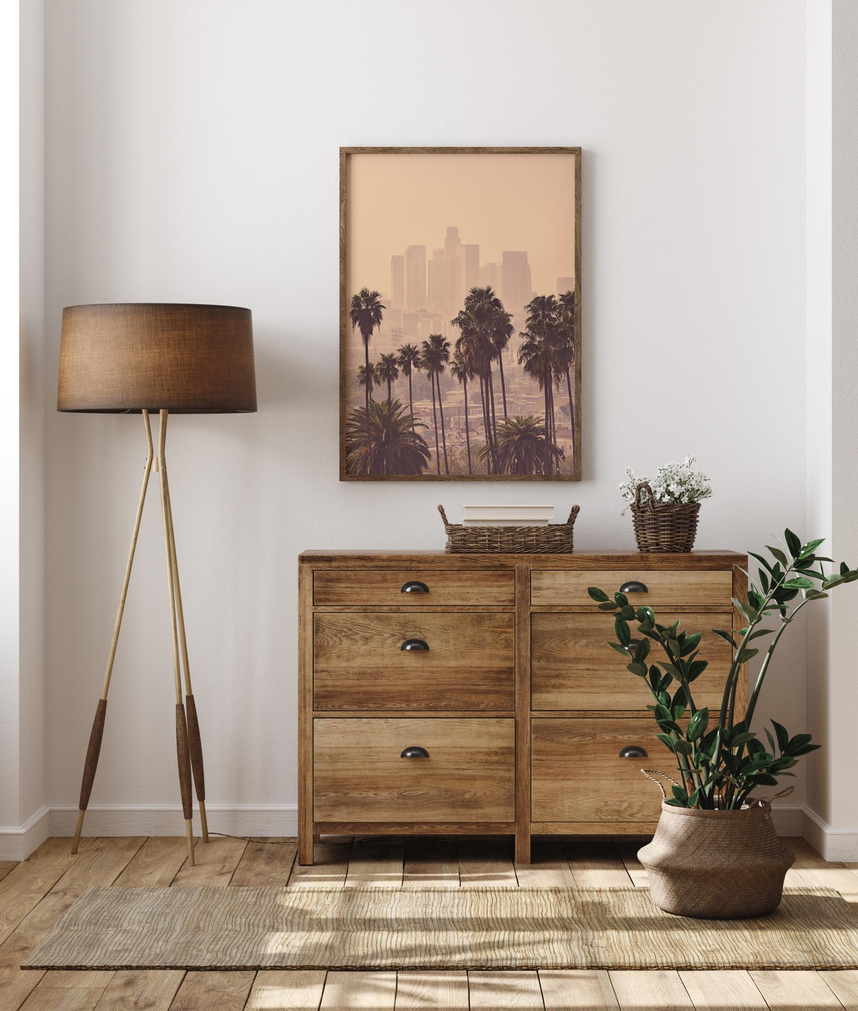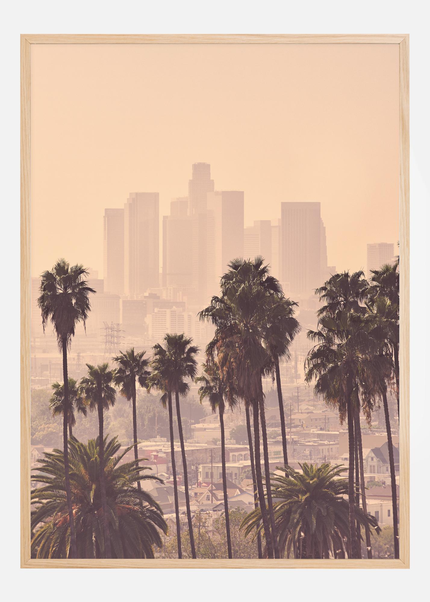 Plakat z mestnim pokrajinskim motivom, kjer so v ospredju palme z liskačem, v ozadju pa silhueta mesta. Palme so v ostri osredotočenosti, megleni nebotičniki v ozadju pa poudarjajo naravo. Čutite lahko avro mestnega življenja v tem izražajnem delu v sepiatonih.