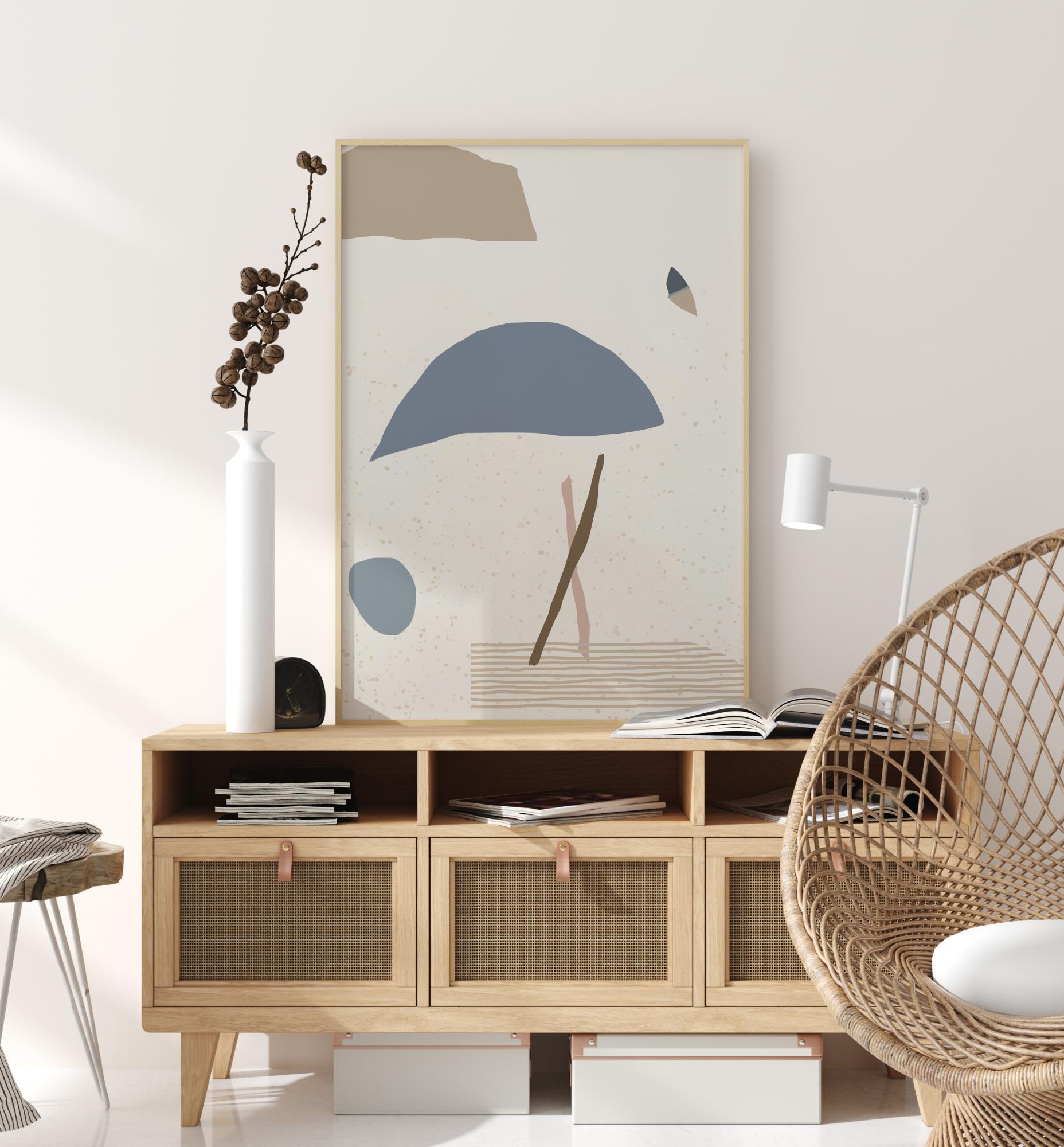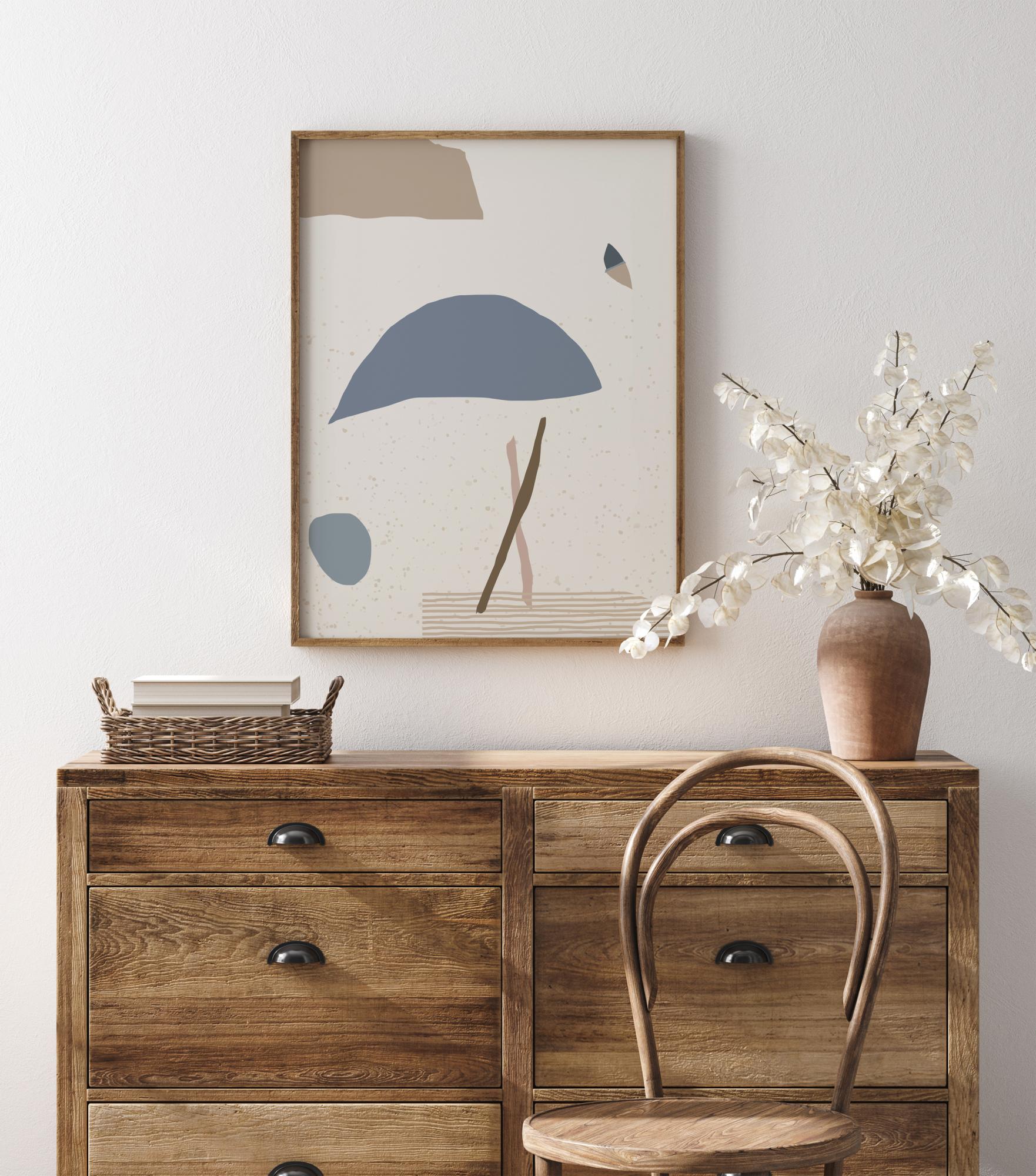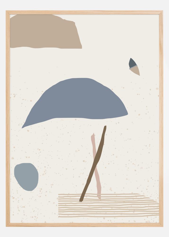 Abstraktni plakat z modrimi, rjavimi in sivimi oblikami na beli podlagi. V tem minimalističnem delu vidite, kar želite - občutek osebe, dežnika, žoge, metulja ali oblaka. Prinesite galerijo v svoj dom s tem kontemplativnim plakatom in spodbudite razpravo o njegovem pomenu.
