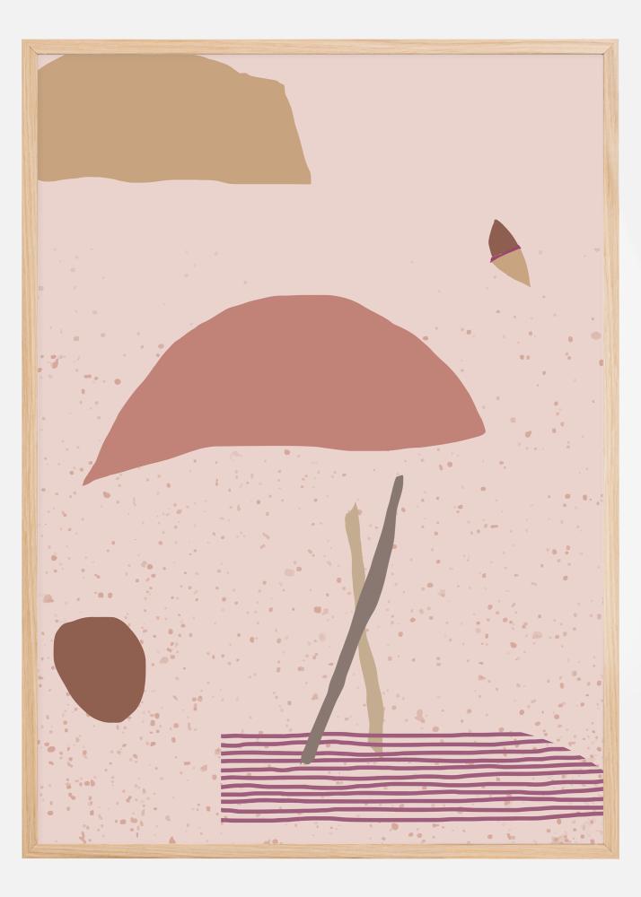 Abstraktna plakata z rdečimi, bež, roza in vijoličnimi oblikami na mehkem pikčastem ozadju. Uživajte v pomirjujočem učinku oblik in razmislite, kaj pomeni, ko vidite kroglo, obliko oblaka, palice, preprogo ali dežnik v delu. Mehki toni so popolni za na primer steno v kopalnici.