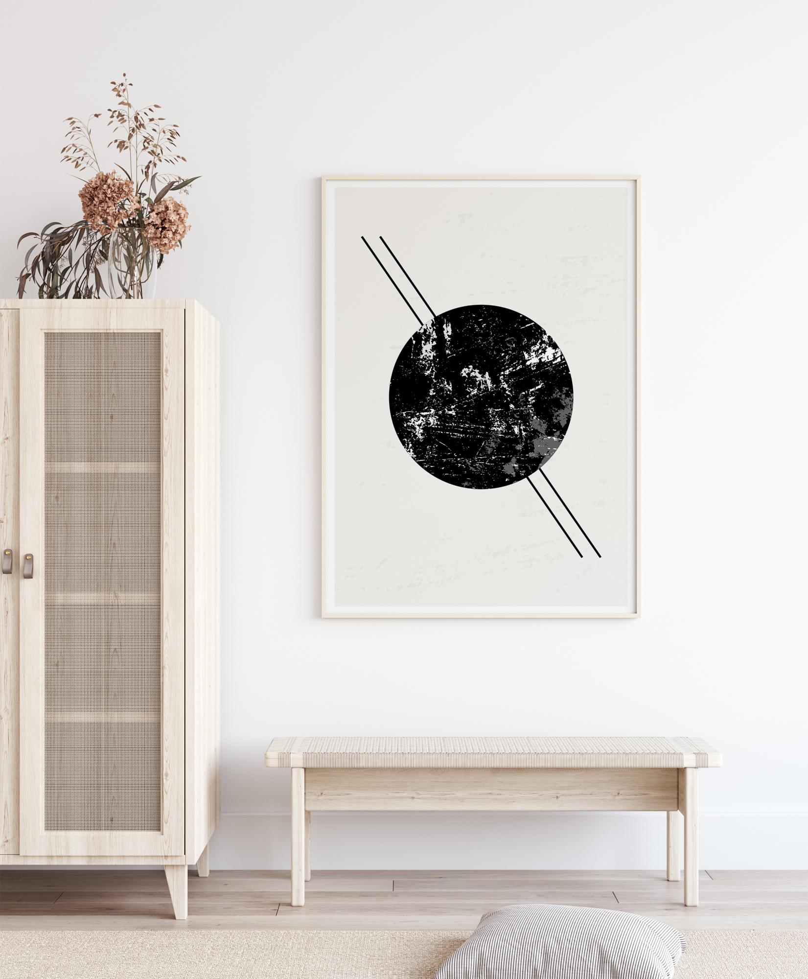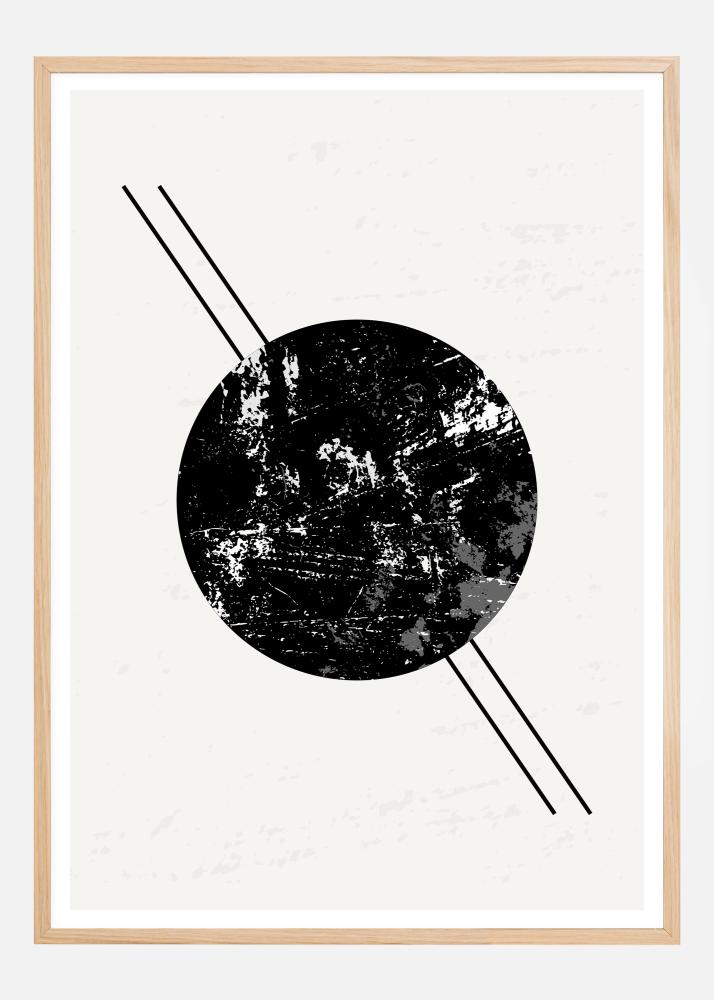 Močan abstraktni plakat s črnim krogom in dvema črtama, ki potekata iz zgornjega levega v spodnji desni kot. Črni krog ima bel in siv marmornat učinek, kjer dve črni črti skoraj tvorita Saturnove prstane. Prinesite ga domov in odkrijte vse možnosti tega miselno spodbudnega umetniškega dela.