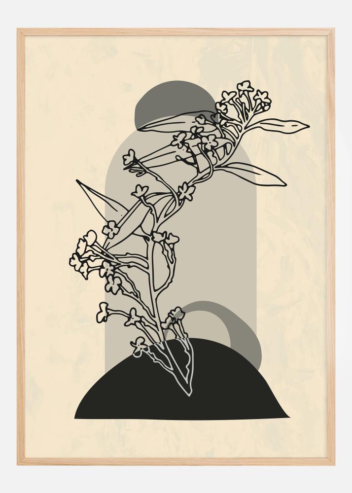Ta prefinjen plakat prikazuje abstraktno socvetje, ki združuje naravne oblike z grafičnimi elementi za sodoben občutek. Motiv uporablja subtilno barvno lestvico z mehkimi bež toni in drznimi črnimi linijami, kar ustvarja kontrast, ki je tako vpadljiv kot eleganten. Dizajn daje velik poudarek kompoziciji in ravnotežju ter postavlja organske oblike cvetov in listov nad trdno črno polkrožno obliko, kar ustvarja iluzijo sence in globine.