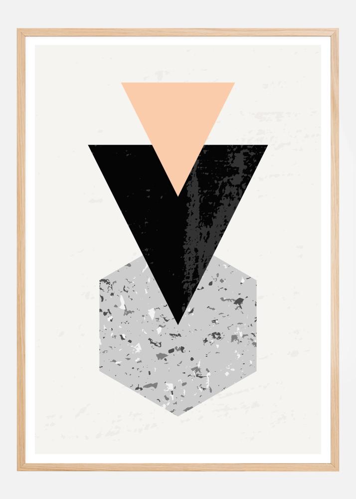 Trikotna geometrijska poster z svetlimi, drznimi oblikami. Dva trikotnika v roza in črni barvi kažeta navzdol, kar vodi pogled do mehkejše modre in črtkaste kocke. Centralno postavljen črni trikotnik ohranja fokus, zaradi česar je to popolna predstavitev v domači pisarni, s svojo manj motečo zasnovo, ki je združljiva z vsakim prostorom.