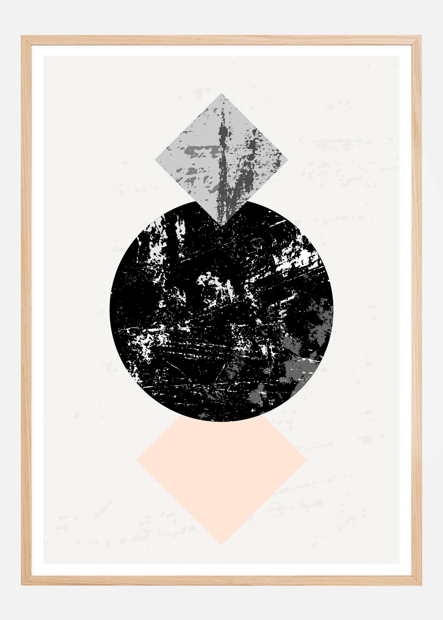 Geometrična abstraktna plakat z dvema kvadratoma, ki obdajata krog. Črn krog ima belo marmoriran vzorec in je obdan z modrim marmoriranim kvadratom in roza kvadratom. Vsak element je postavljen na točko, ki usmerja oko na središčno zemeljsko kroglo. Dodajte dramatičnost preprosti steni s tem izraznim umetniškim delom.