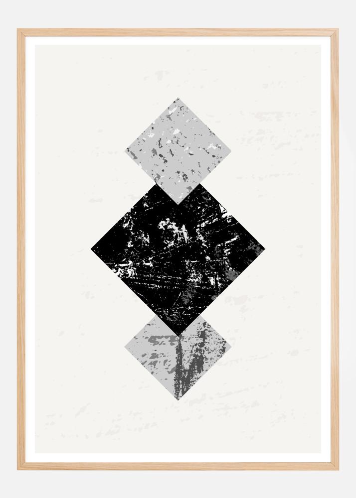 Geometrijski plakat s tremi kvadrati, ki so nameščeni na sredini bele podlage. Velik kvadrat v sredini je črn z marmornatimi učinki. Na vsaki strani sta dva manjša modra kvadrata z marmornatimi in gramoznimi učinki. Oko je skozi delo vodeno s pomočjo točk v vsakem kvadratu tega skoraj simetričnega dela.