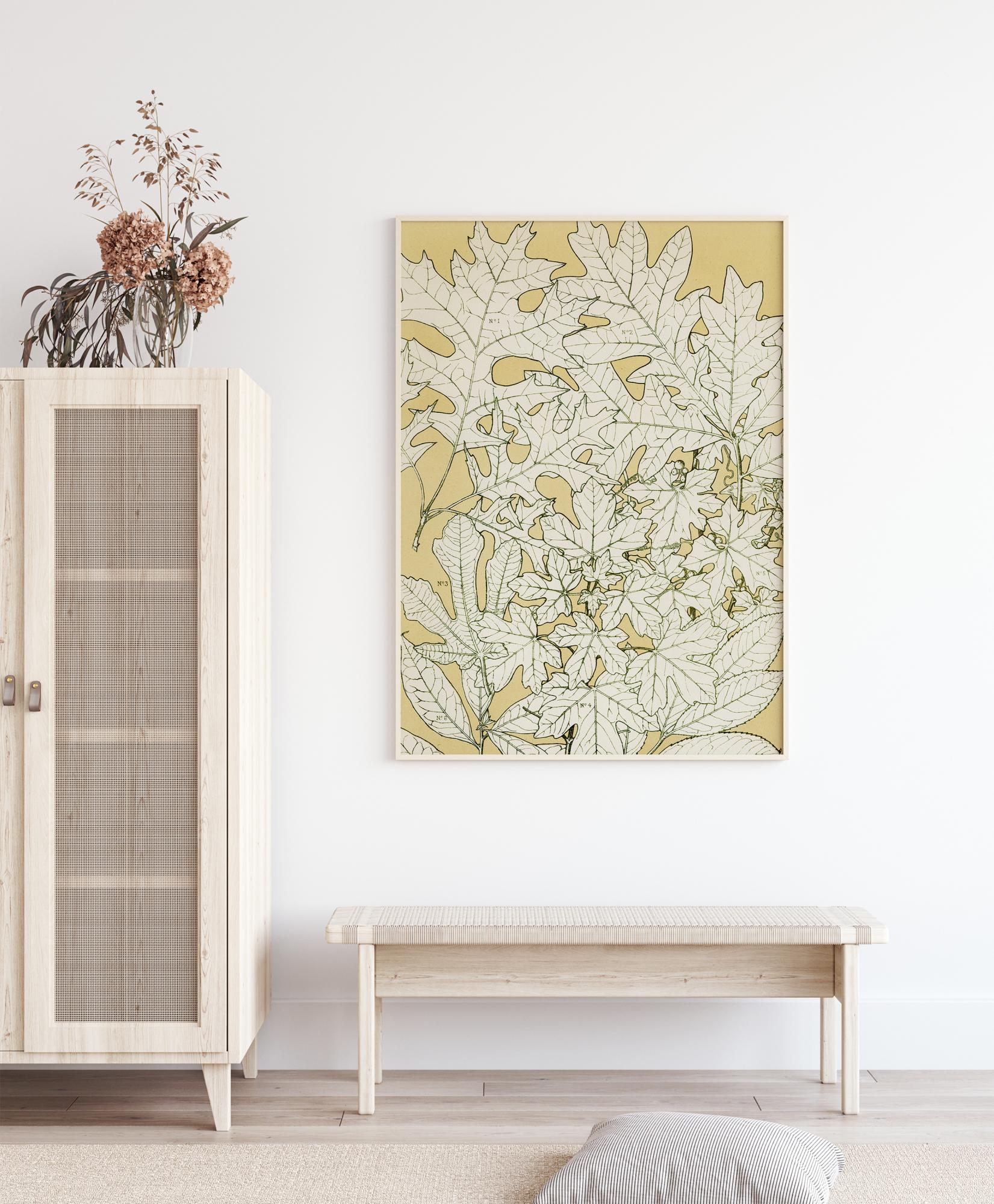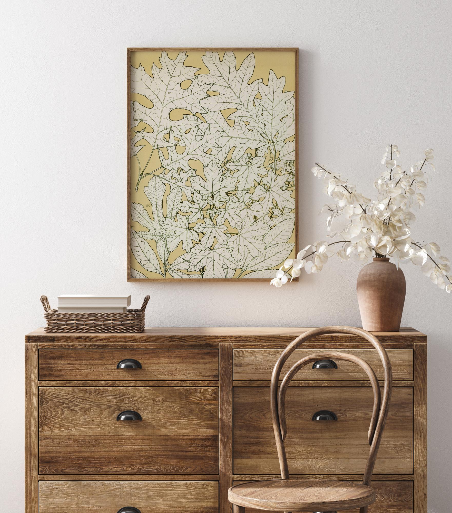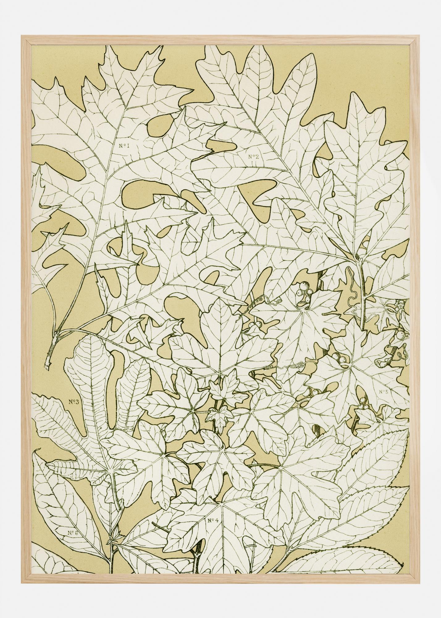 Abstraktni plakat z listjem s preprostimi narisanimi listi na bledi zlati podlagi. Različni listi so natančno narisani, skupaj s svojimi žilami in stebli. Zaradi pomanjkanja barve izstopajo na enobarvni podlagi, kar prikazuje vse podrobnosti. Obesite ta plakat na preprosto steno, da ustvarite naraven občutek v vašem domu.