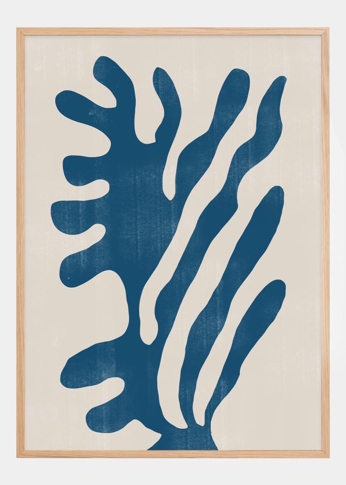 Ta drzna in živahna plakat zajame bistvo abstraktnega listja s svojimi valovitimi modrimi črtami na kremnem ozadju. Stiliziran motiv spominja na podvodno rastlinstvo ali perje, ki pleše na vetru, kar daje občutek svobode in narave. To umetniško delo združuje organsko lepoto z moderno grafično oblikovalsko estetiko.