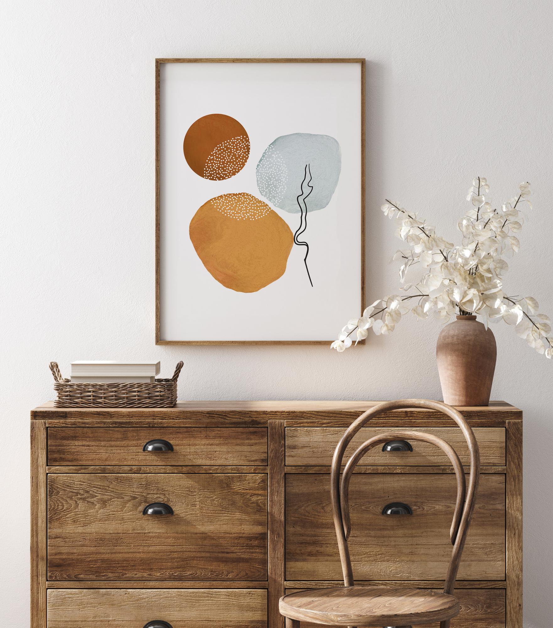 Preprosta abstraktna plakat z tremi glavnimi krožnimi oblikami. Nad temi tremi oblikami se prekriva krog, ki ga sestavljajo majhne bele pike, podobne regratovemu klobuku. Dve preprosti črti se ovijata okoli modre oblike in združujeta delo v celoto. Ta tisk je odličen dodatek k sofisticirani galerijski steni.