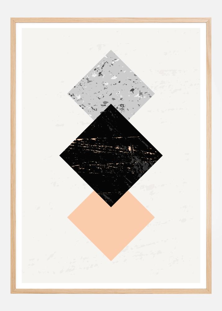 Geometrični poster s tremi kvadrati v različnih barvah. Mehkejša slika, kjer je fokus na črnem kvadratu, ki pa ga na drugačen način mehča moder kvadrat zgoraj in rožnati kvadrat spodaj, od katerih imata oba dodatne vzorce. Dodajte kanček drame, brez da bi bili preveč vpadljivi, ko obesite ta plakat v hodnik ali v katerikoli sobi z naravno svetlobo.