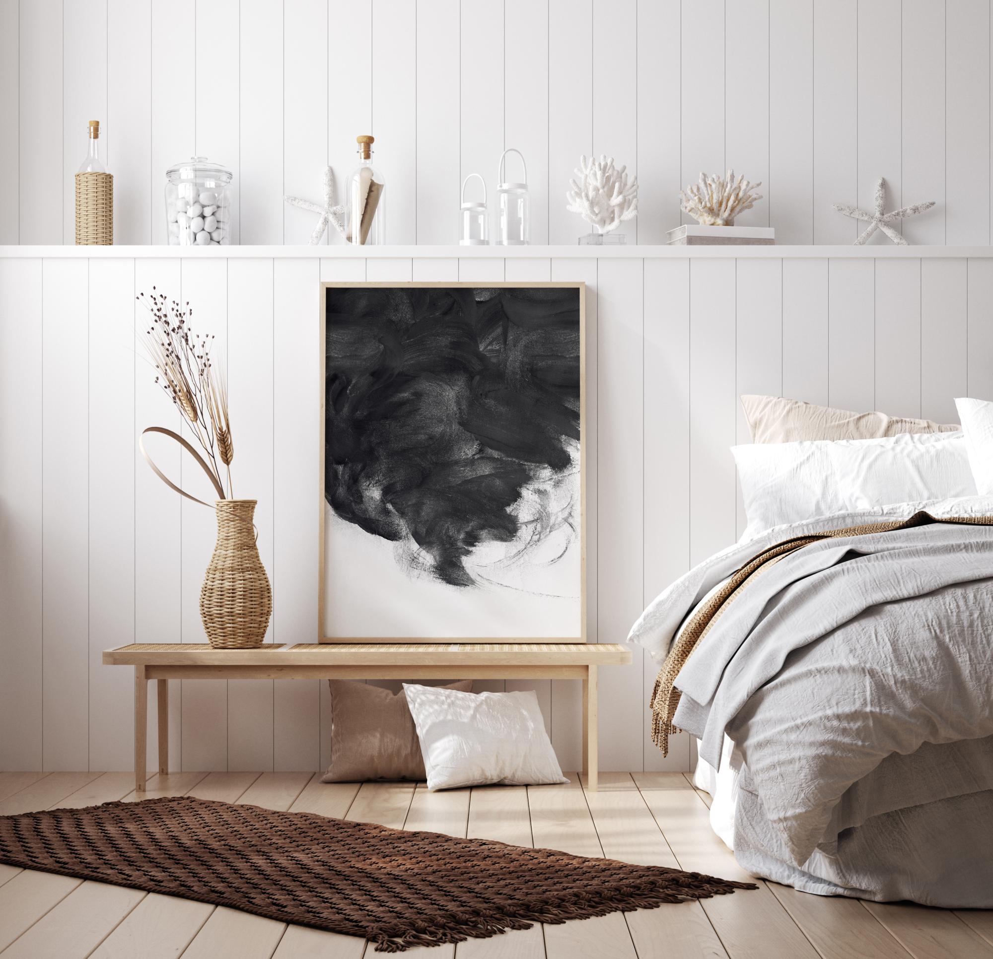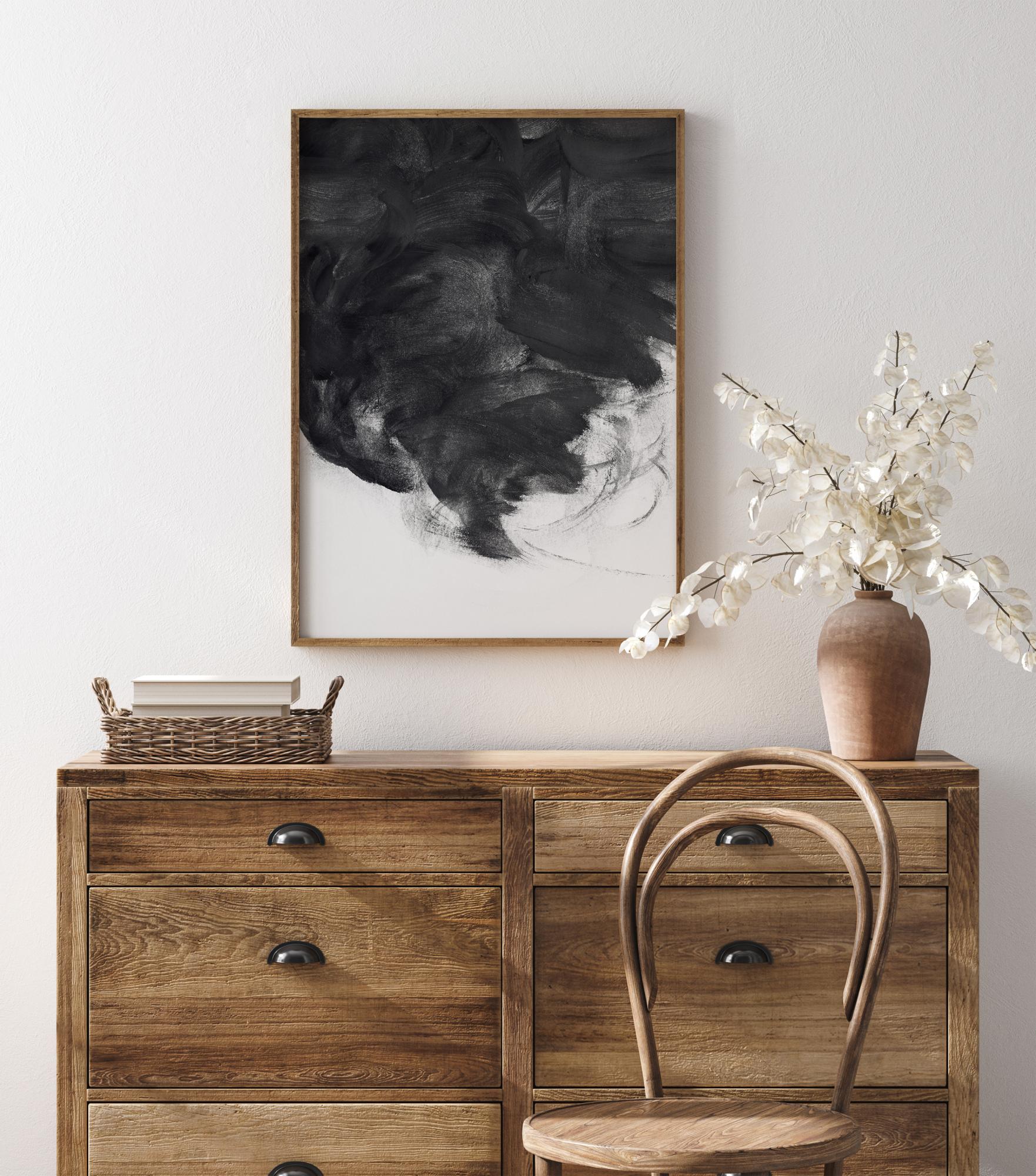 Abstraktni poster s črno spiralo. To čudovito črno-belo delo vodi pogled od vrha do sredine skozi črno spiralo. Kjer se črna sreča z belo, si lahko predstavljate jamo, neurje, vihar ali oblak na tem posterju, ki je poln dinamike. Namestite ga na svetlo steno za dramatičen in epski občutek.