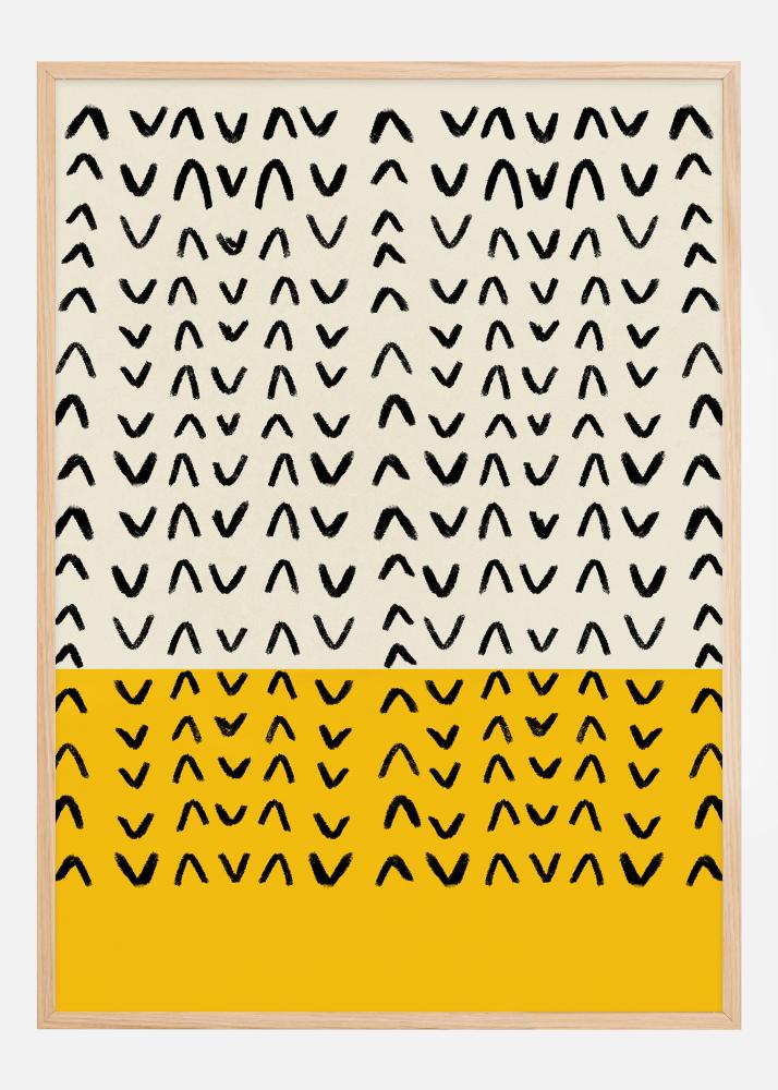 Doživite sodobno in minimalistično estetiko s tem umetniškim plakatom. Dizajn predstavlja ritmično kompozicijo abstraktnih, črnih valovitih oblik na mehkem, nevtralnem ozadju. Motiv je ostro razdeljen z močnim rumenim delom v spodnji tretjini, ki prinaša drzen kontrast k pretežno mirnemu in harmoničnemu zgornjemu delu. Ta plakat je popoln za modno osveščeno osebo, ki želi vnesti sodoben in eleganten občutek v svoj dom ali pisarno.