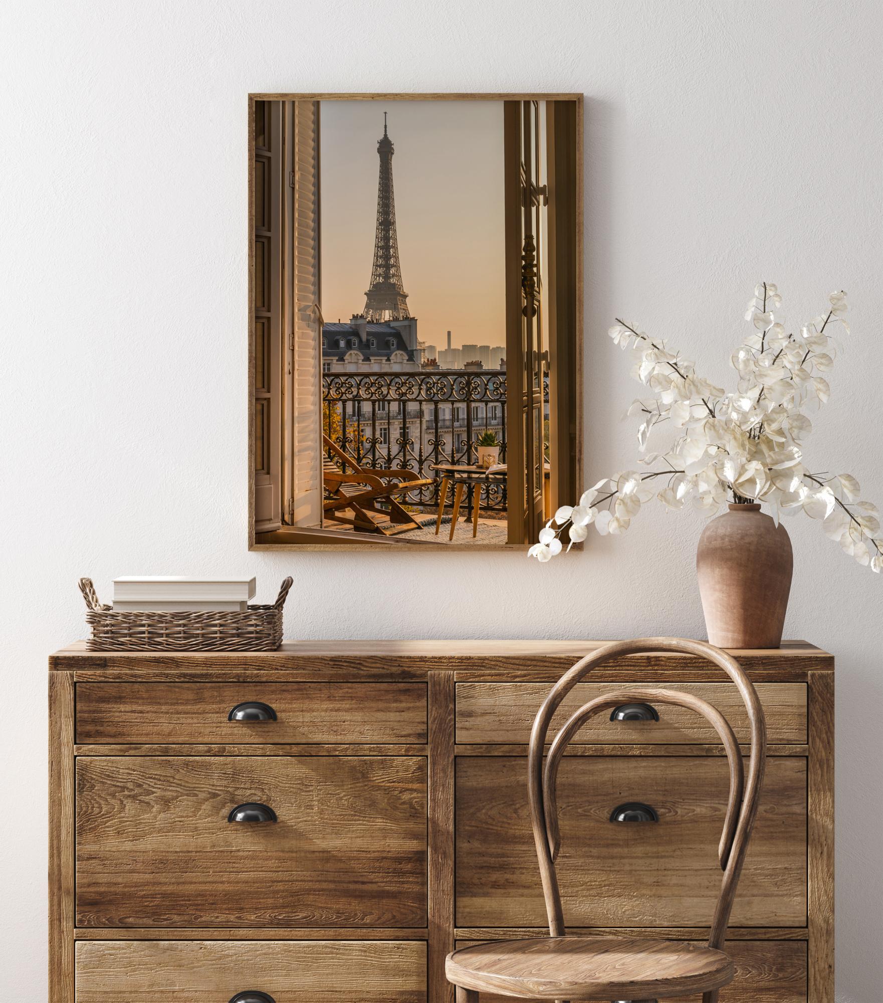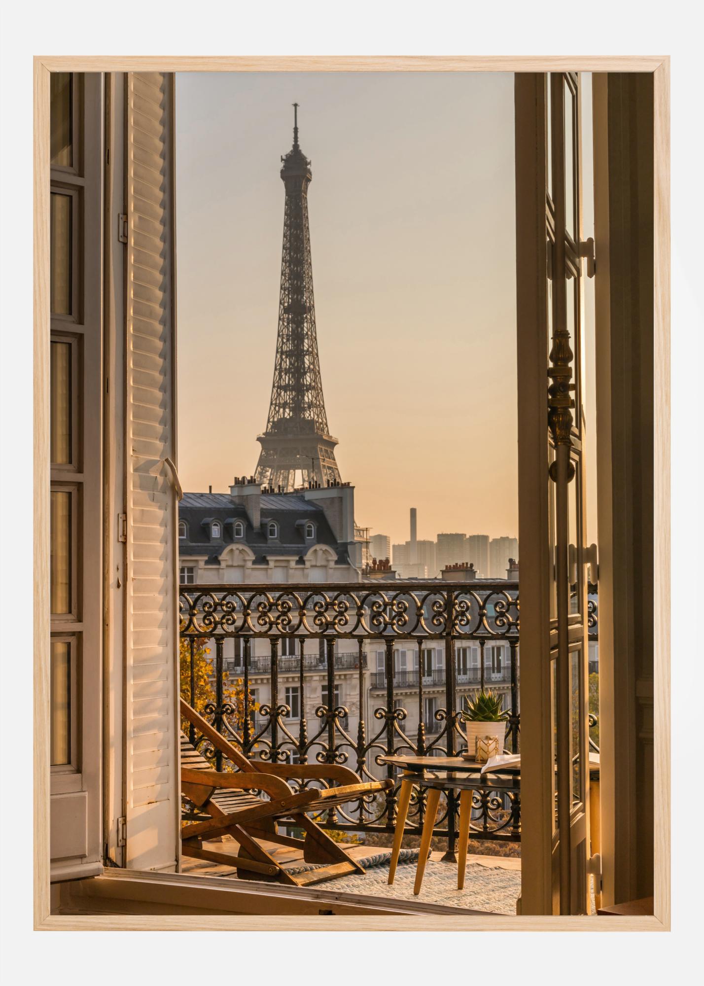 Lepa mestna plakatna slika, ki prikazuje Eifflov stolp v daljavi. Okrašena balkon je prizorišče te slike z mehko jutranjo svetlobo, ki prekriva stol in ograjo. Stolp stoji visoko in privlači pogled. Skoraj lahko začutite hladen vetrič skozi odprta vrata.