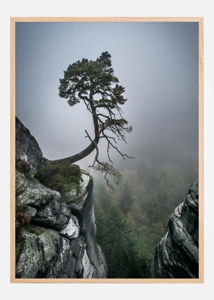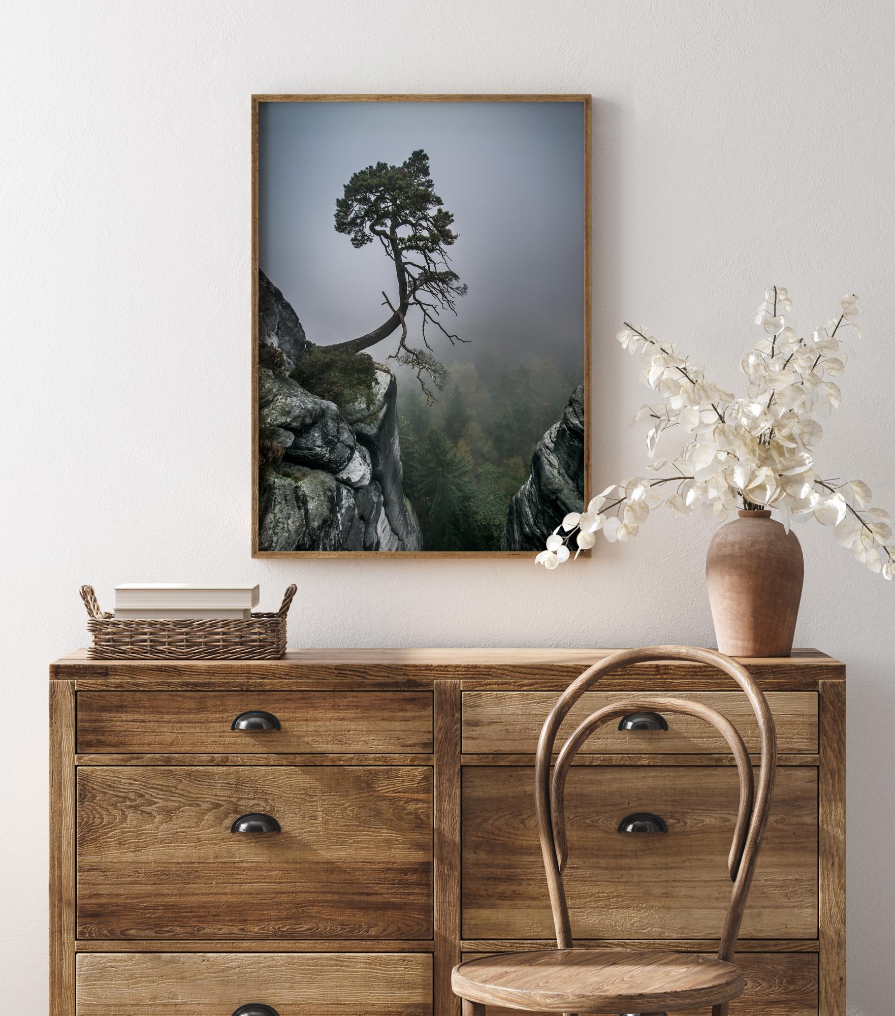 Dramatična naravna slika zvitega drevesa, ki raste na strani pečine. Drevo se v polnih barvah nagiba v prepad med dvema sivima pečinama. V spodnjem delu se prikazuje meglen gozd, svetloba pa poudarja vijugasto drevo. Prinesite dramatiko narave domov, ko kupite to delo.