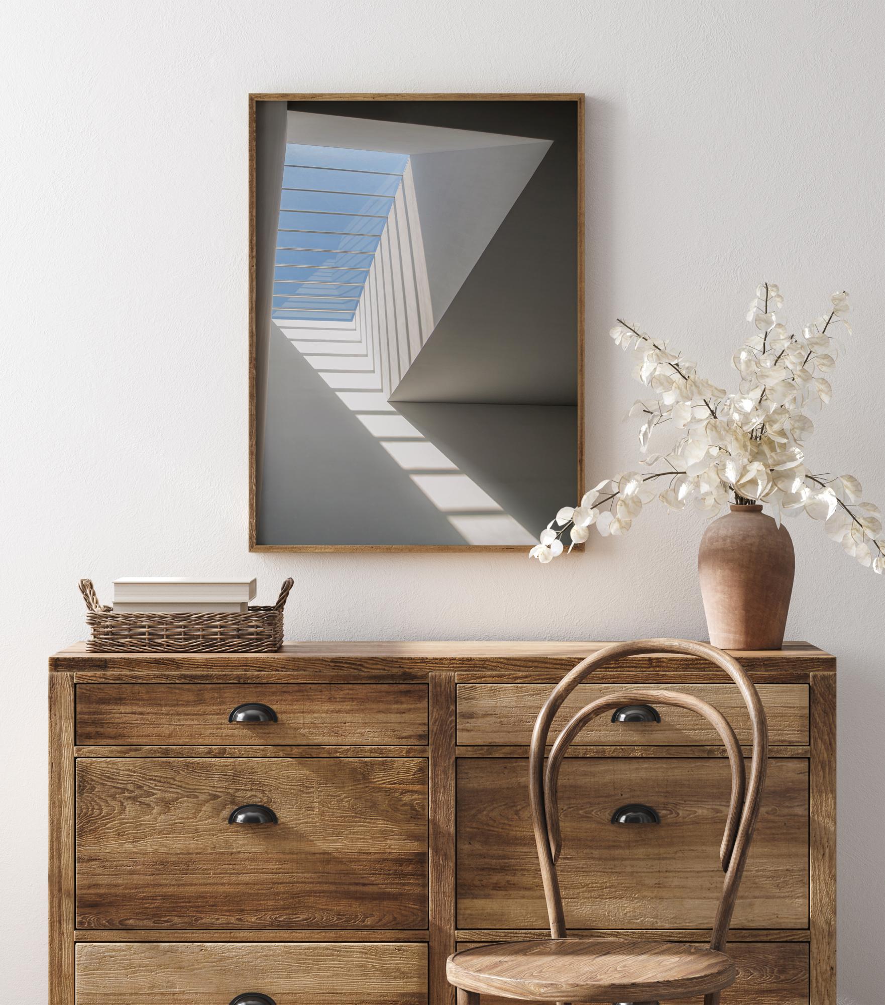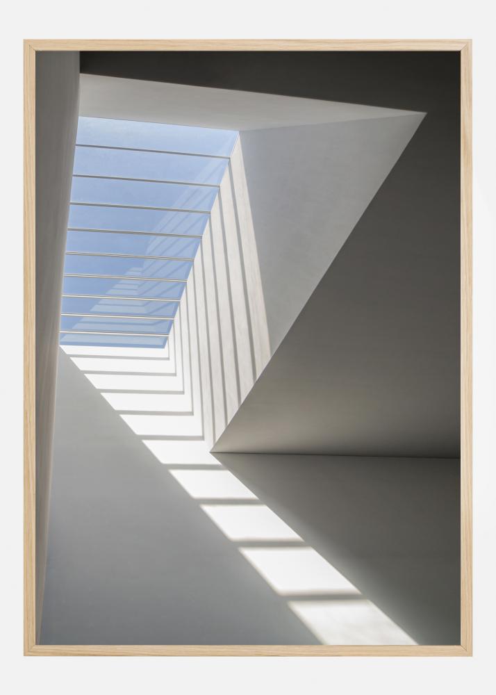 Preprost in zračen plakat v svetli beli sobi. Na levi strani je strešno okno z modrim nebom. Svetloba, ki prodira skozi okno, meče sence, ki izgledajo kot lestev, ki vodi oko proti svetlobi zunaj. Privabite svetlost v temno sobo s pomočjo te mirne slike.