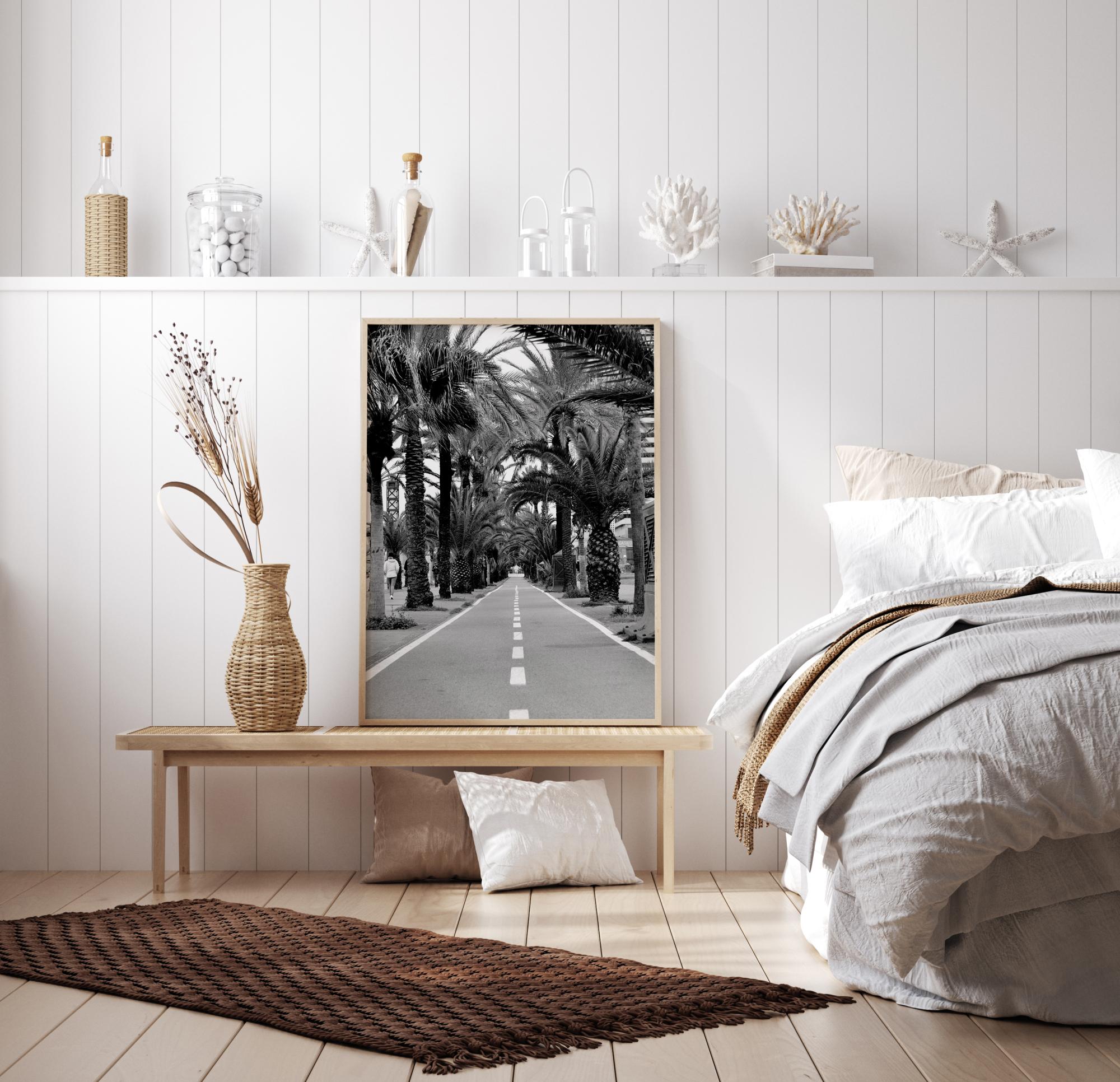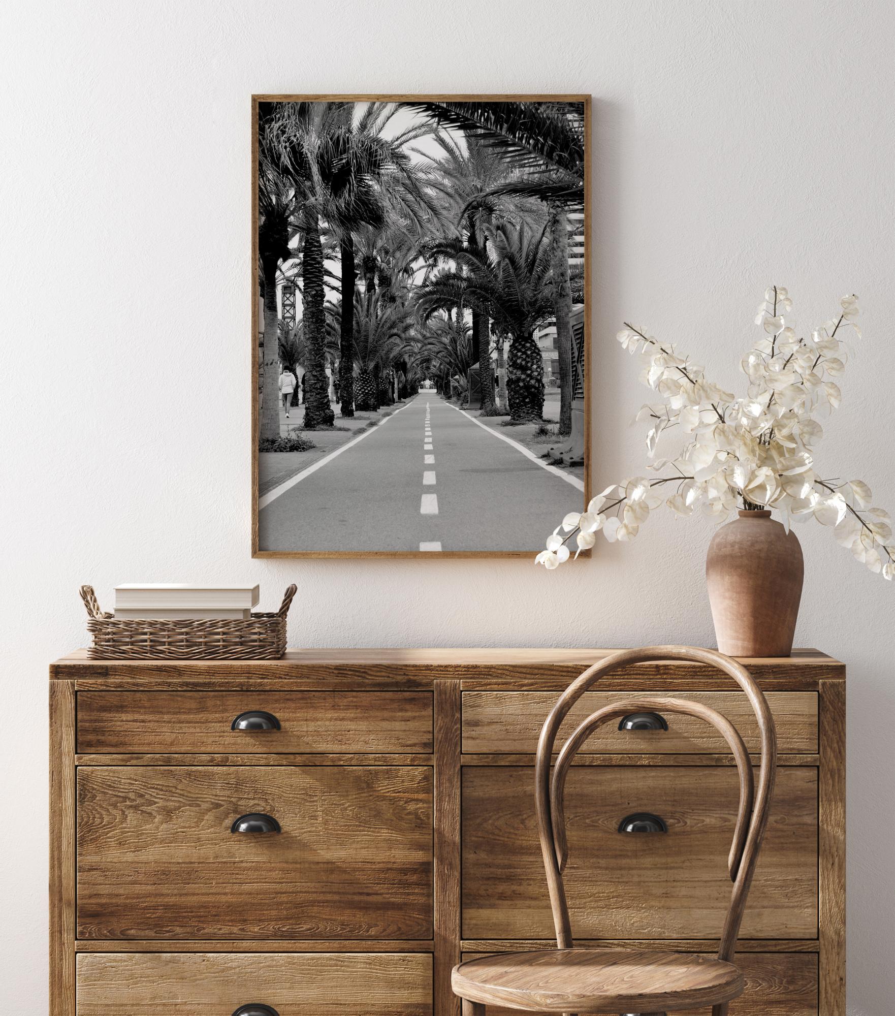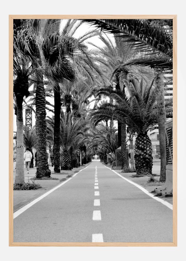 Plakat pokrajine ceste, ki teče skozi nasad palm. Palme tvorijo mejo za cesto, medtem ko bele črte vodijo v daljavo. Drevesa ustvarjajo lok, ki usmerja pogled v novo smer. Postavite to črno-belo lepoto na steno za eksotičen občutek.