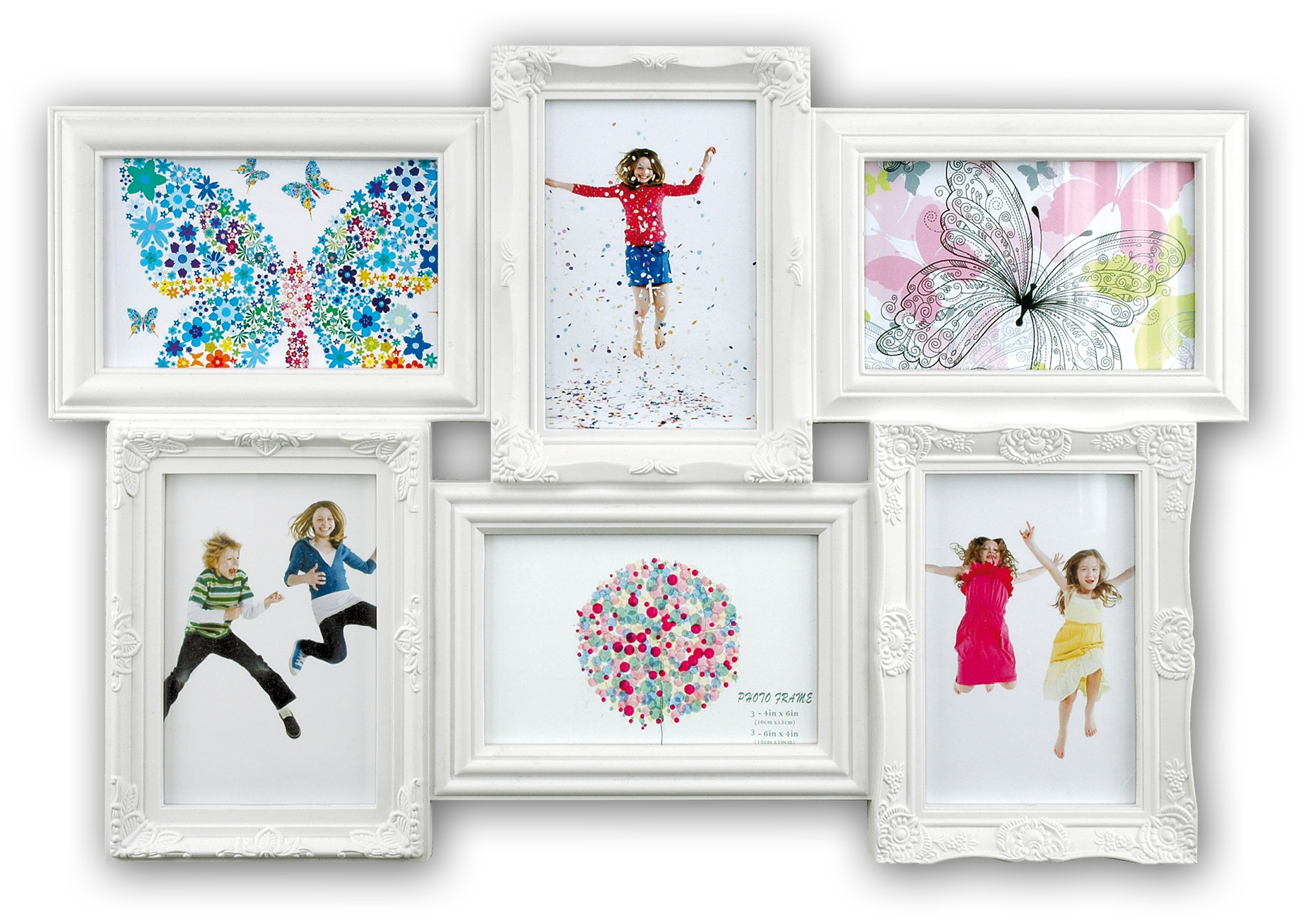 Lepo okrašen kolaž okvir v beli barvi s širokim profilom v klasičnem slogu. Popoln za fotografije, ki so vam še posebej všeč.