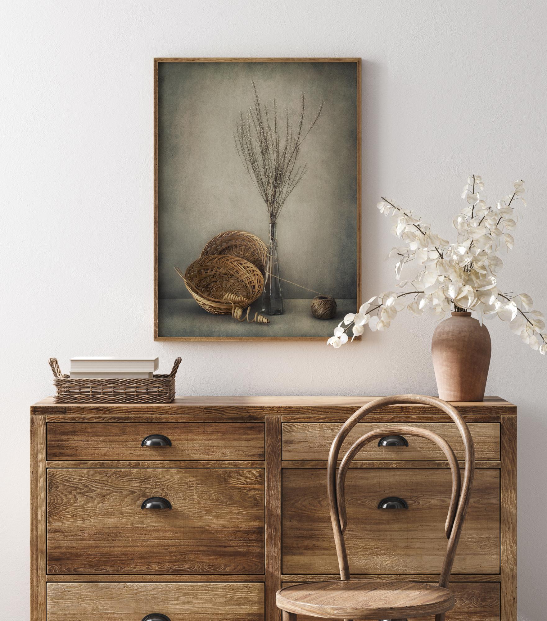 Plakat s tihotapljenimi košarami, lončeno posodo in steklenico zasušene trave. To delo ima subtilne sepijaste in sive tone, ki tvorijo mehko in harmonično delo. Prinesite malo miru v dom s tem plakatom in ga kombinirajte z nevtralno steno, da ne bo prevzel preveč pozornosti.