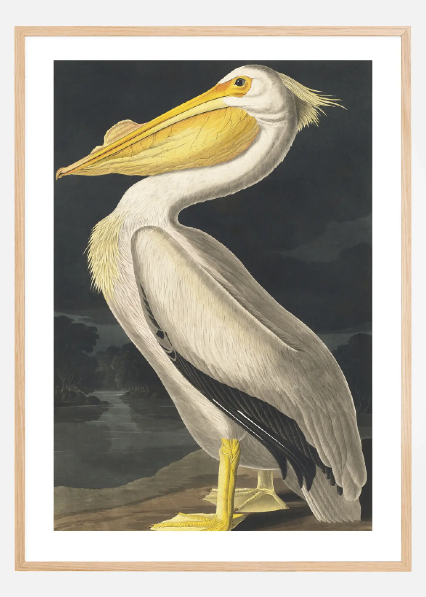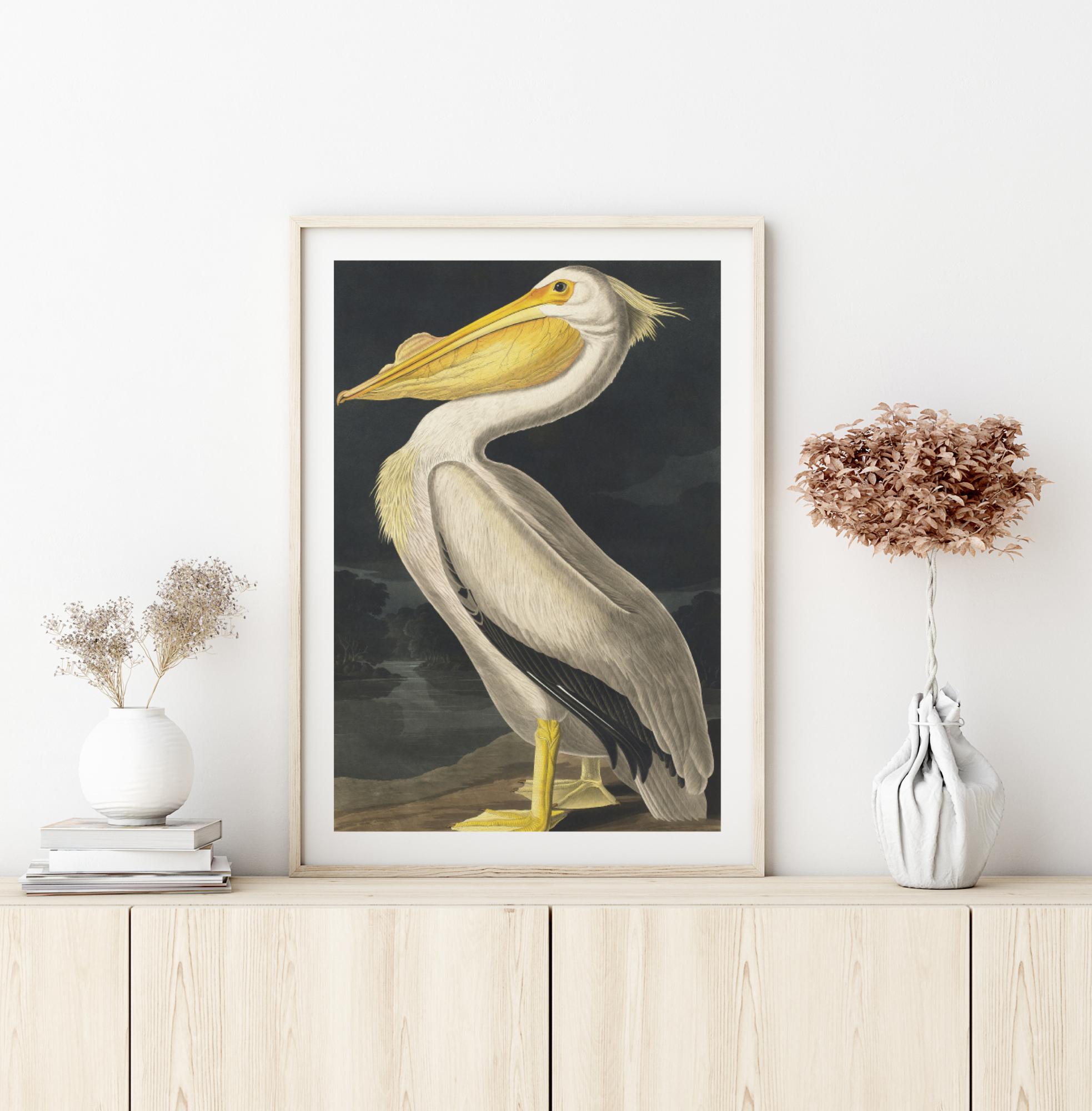 Naravni plakat naslikanega pelikana. Tukaj ptica sedi visoko in ponosno z robustim rumenim kljunom ob prsih. Označene rumene noge in bela prsa stojijo v ostri kontrast zatemnjenemu, zadržanemu ozadju. Prinesite občutek starodavnih slik, ko kupite to čudovito podobo.
