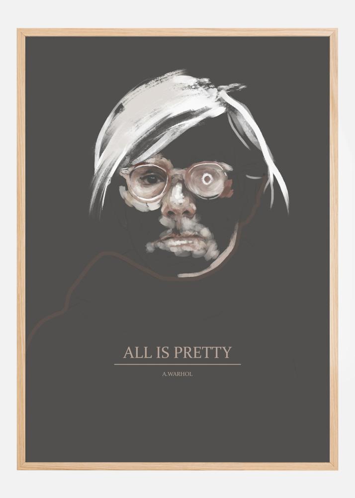 Umetniški plakat Andyja Warhola. Ta portret umetnika prikazuje njegove bele lase in se osredotoča na njegove oči, eno mirno in eno divje. Geslo - Vse je lepo – se nahaja na dnu, da vam ponudi navdihujoč citat in sporočilo, ko hodite mimo plakata, kjer visi v vašem domu.