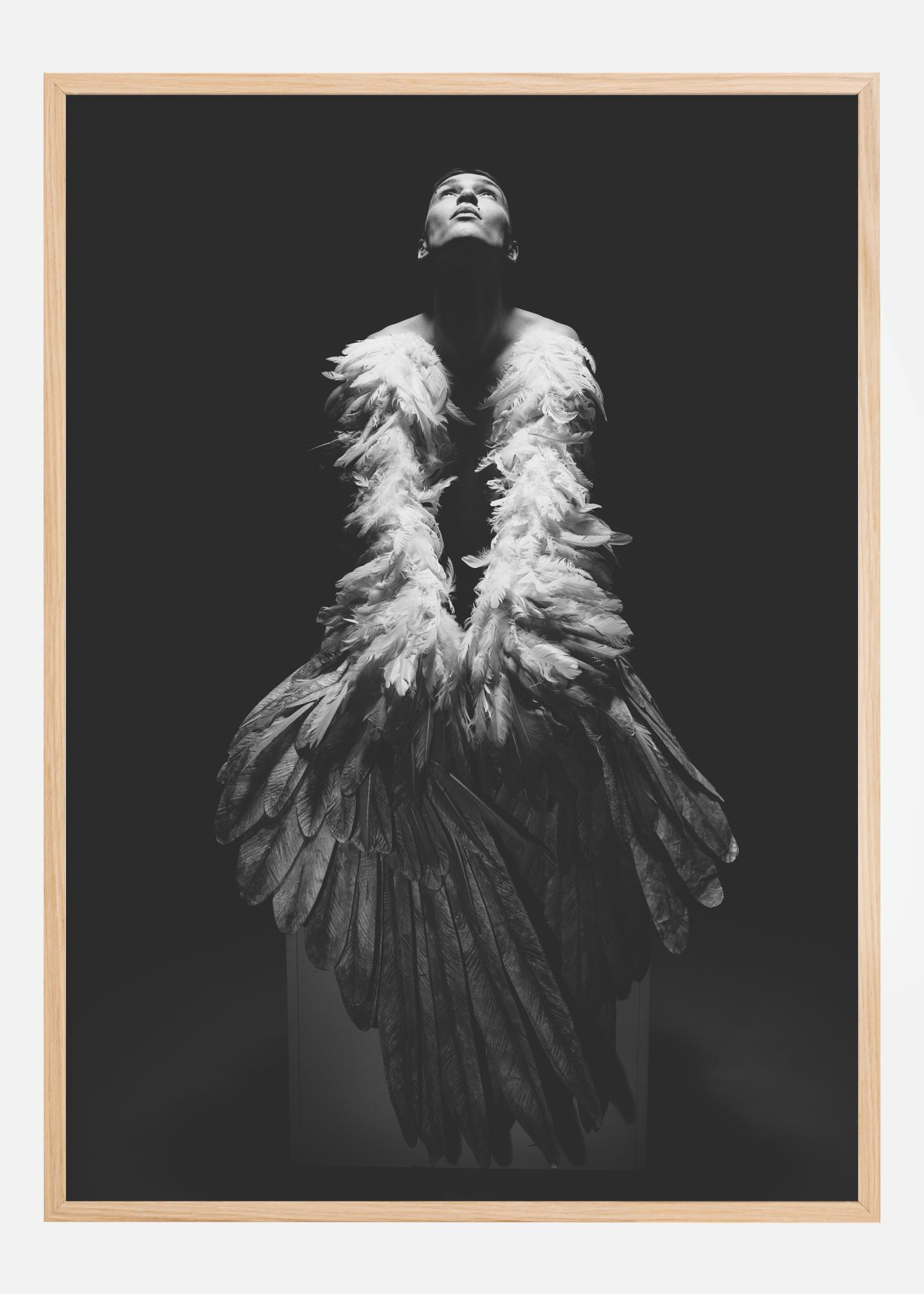 Portretni plakat človeka v dolgem pernatem kostumu, ki posnema let v zraku. Stoji pred črnim ozadjem in gleda proti nebu. Reflektor sveti od zgoraj, kar poudari njegov obraz in ramena, tako da se samodejno osredotočiš nanj, ko gledaš to dramatično delo.