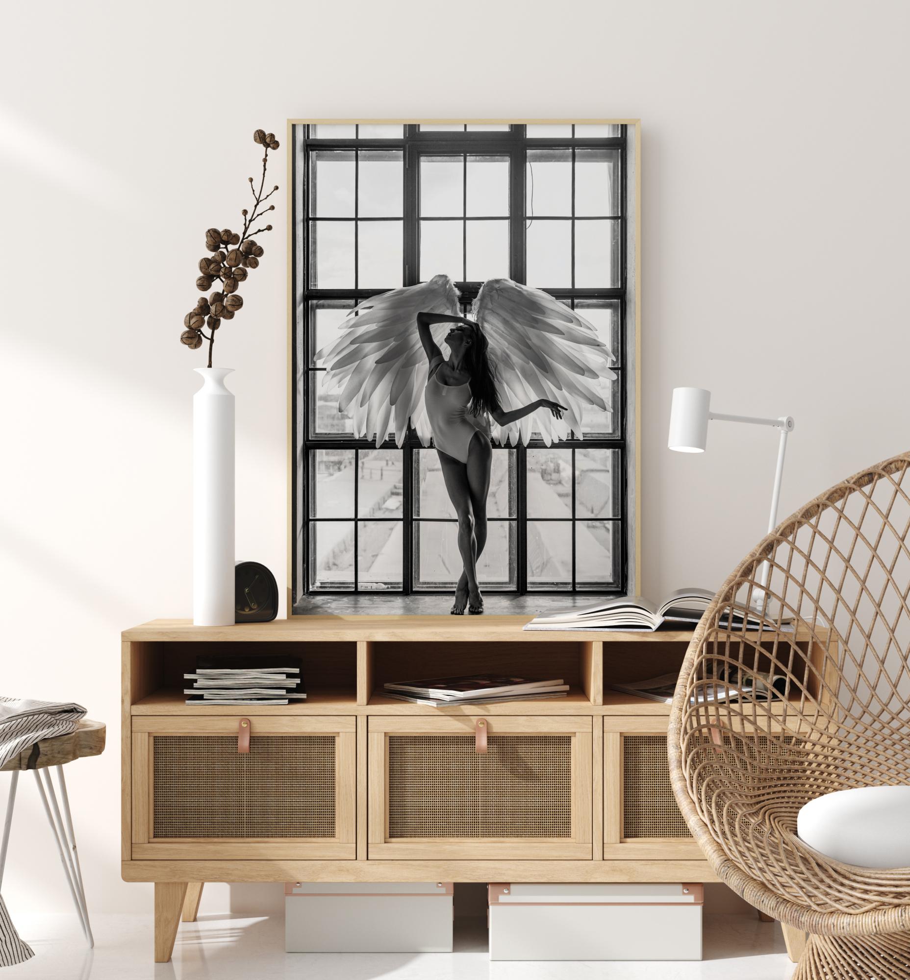 Čudovit foto umetniški plakat v temni sivini ženski, ki pozira v velikem oknu, oblečena v bodi in velike lepe angelske peruti. Plakat, ki ga je enostavno kombinirati z drugimi priljubljenimi motivi, vendar je prav tako primeren kot samostojen uporniški pogled.