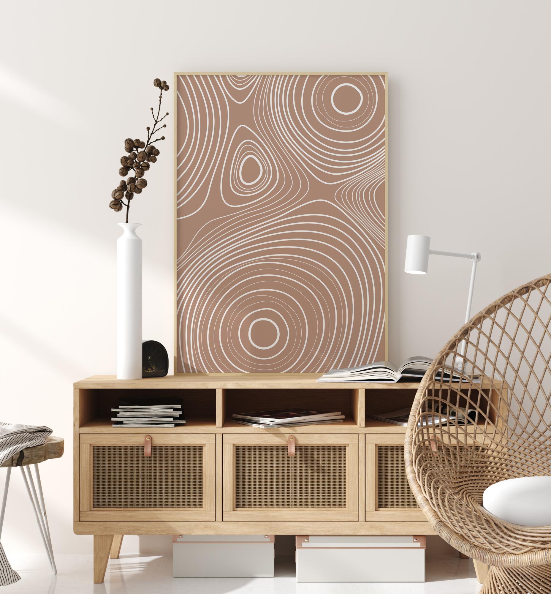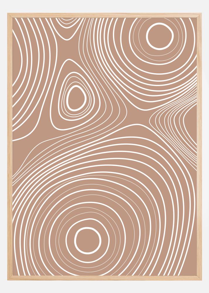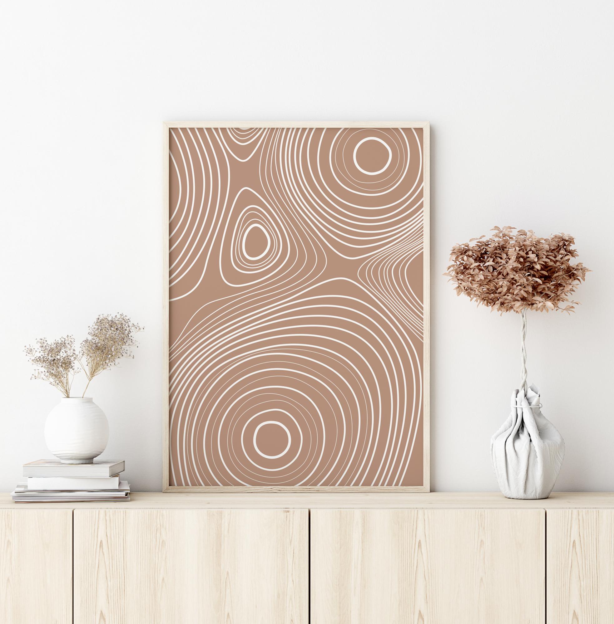 Vrtinčast abstrakten plakat z belimi črtami na svetlo rjavi podlagi. Oglejte si te bele kroge, kako se širijo navzven v tej osupljivi sliki. Dovolite si, da se izgubite v teh pomirjujočih vrtincih, ko obesite ta miren plakat v svojem domu, kar zagotavlja popolno sprostitev v kopalnici ali dnevni sobi.