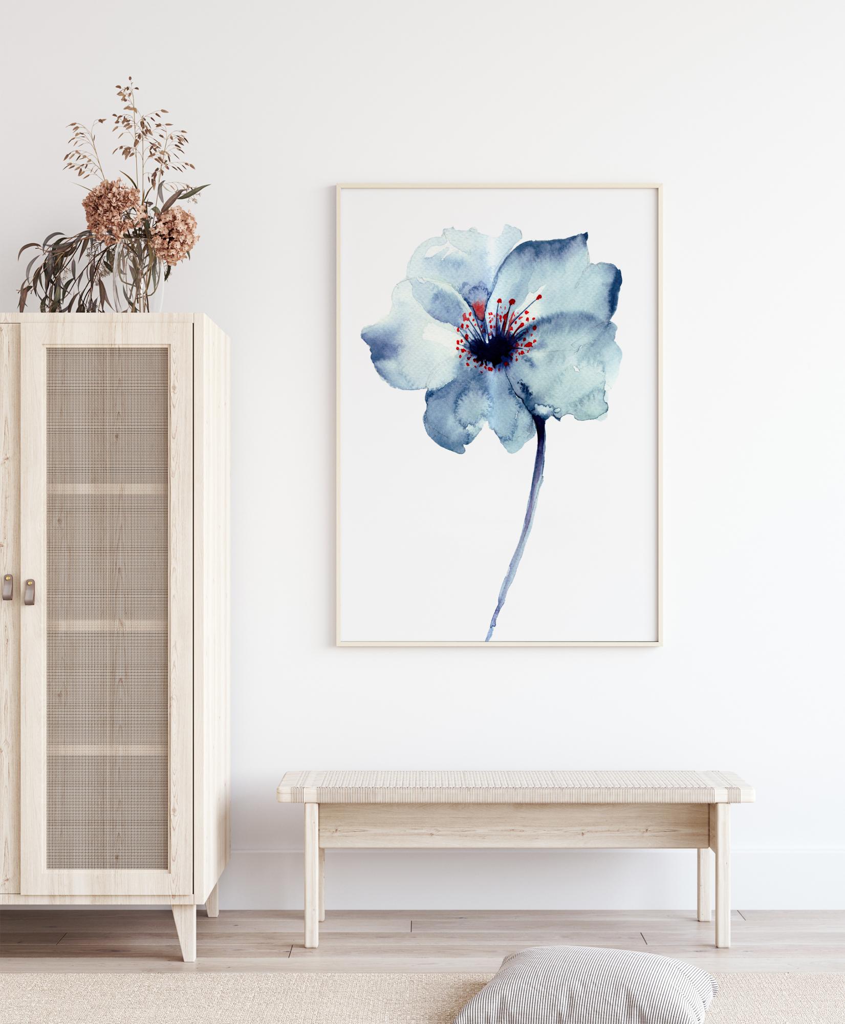 Čudovita cvetlica, naslikana v modri in rdeči akvarelni tehniki. Čudovit plakat v vsej svoji preprostosti, ki se enako dobro ujema v kuhinji ali hodniku kot v dnevni sobi ali spalnici.