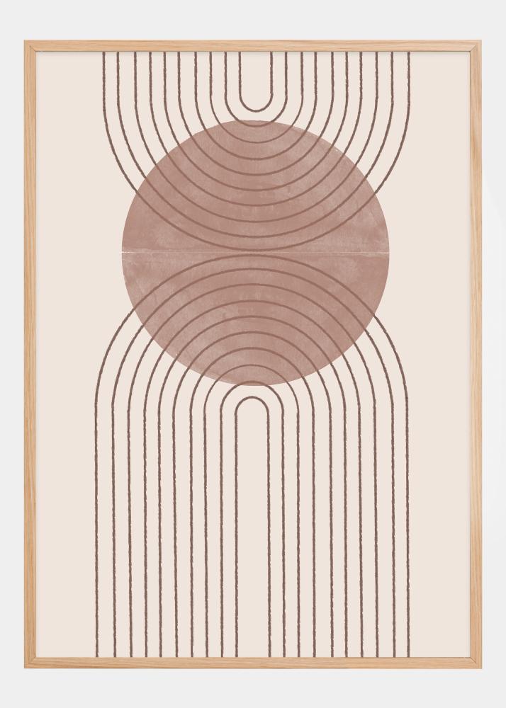 Ta plakat vabi občutek miru in organski tok s svojimi mehkimi, prijemljivimi linijami, ki se zbirajo okoli osrednjega kroga v toplem, terakota odtenku. Pomirjujoči vzorec spominja na peščene sipine, ki jih oblikuje veter, ali na mirne valove, ki se valijo proti obali, ter ponuja trenutek razmisleka in miru.