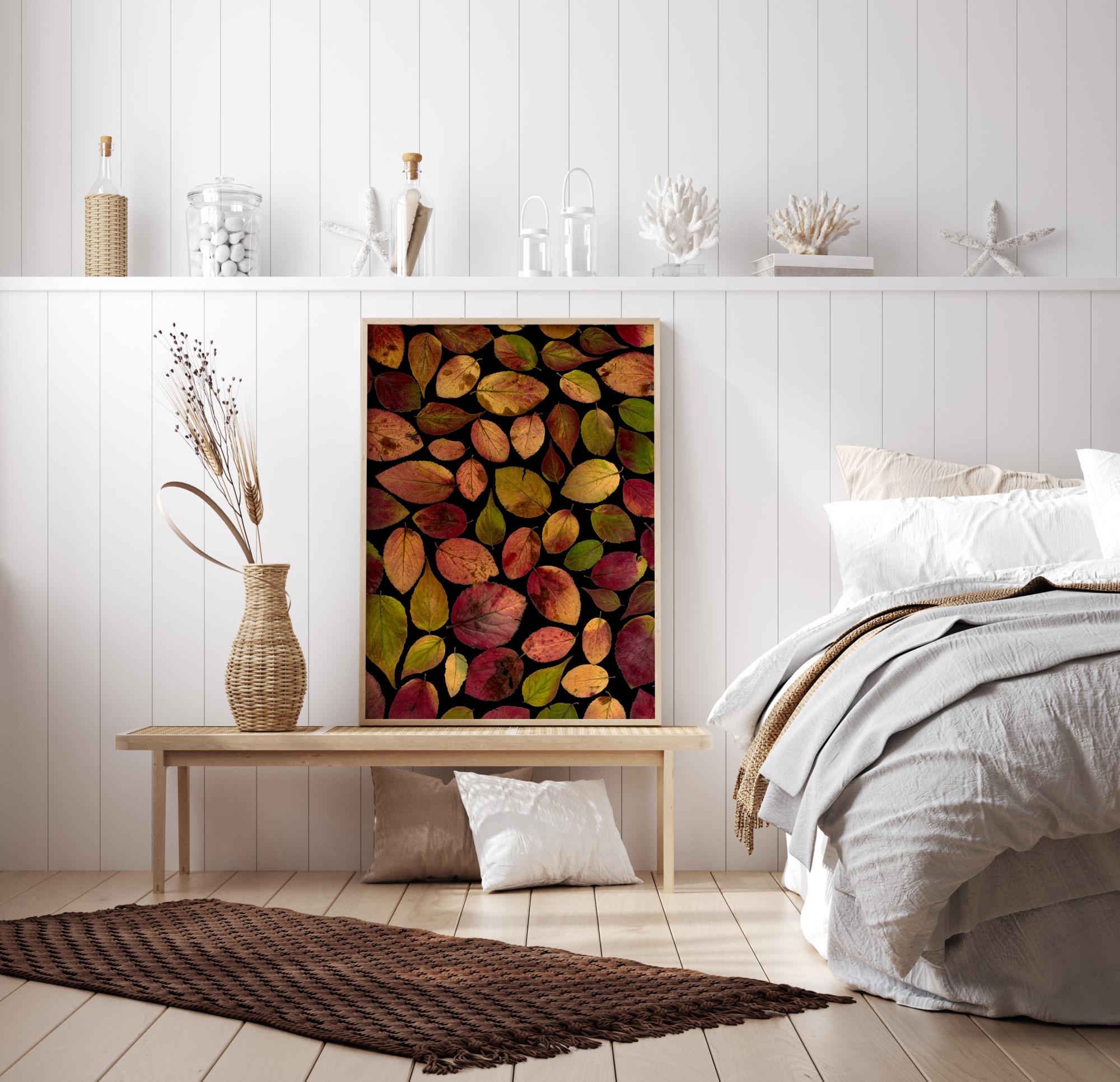 Plakat z vzorcem jesenskih listov. Vrsta rumenih, roza in rdečih barv se srečuje v tej organizirani zbirki listov. Vsi listi se združijo proti temnemu ozadju, kar prinaša živahnost jeseni na ta plakat. Popoln barvni poudarek v kuhinji ali hodniku.