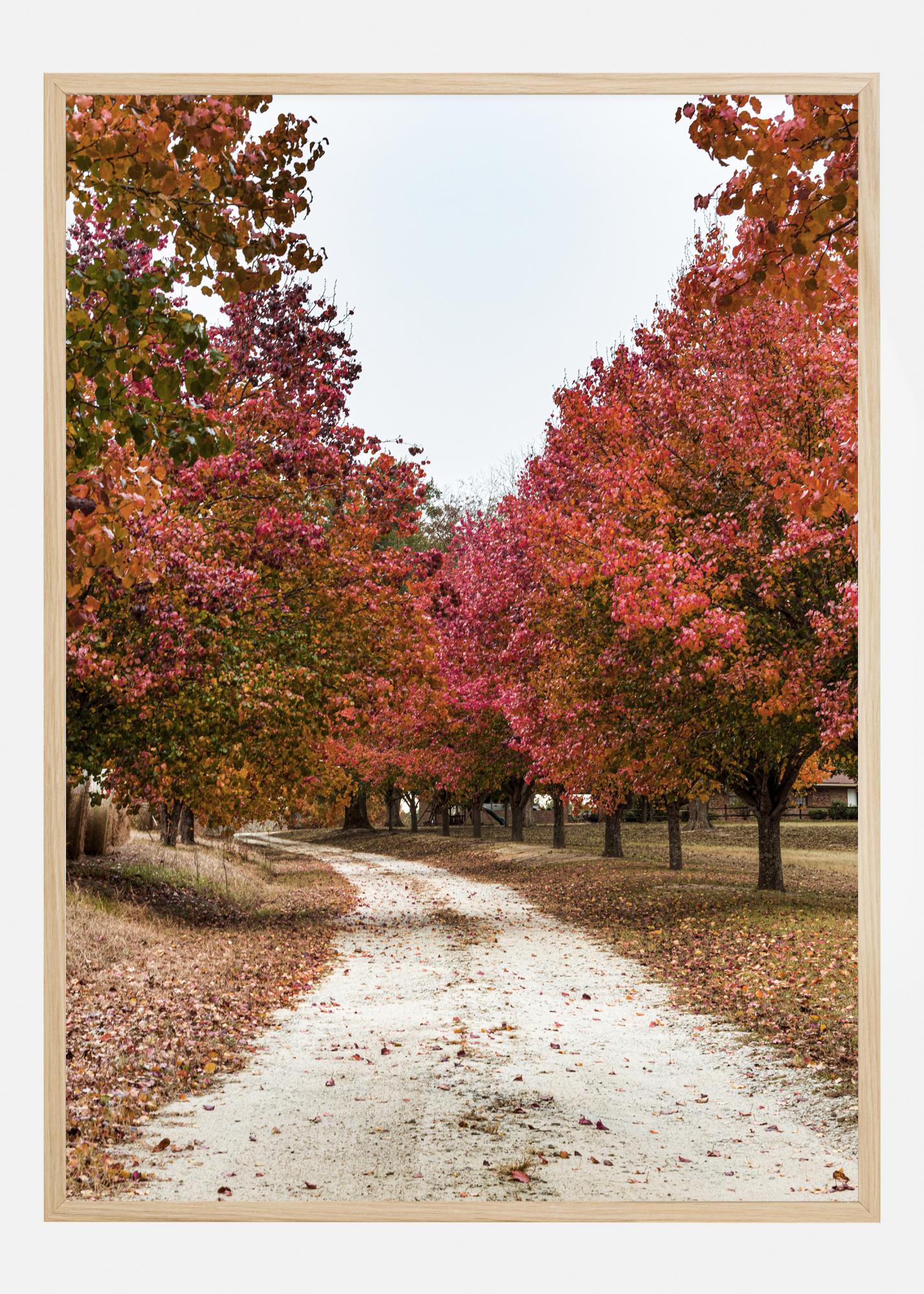 Plakat z jesenskim parkom in ulico. Bela gramozna potka seka skozi živo rdeče listnate drevesa. Svetlo modro nebo se zrcali na poti, ko se ovija v daljavi. Ponovno doživljajte lepoto jesenskih barv vsak dan s tem plakatom v vašem domu. Ta plakat lahko obesite skupaj s katerokoli sliko.
