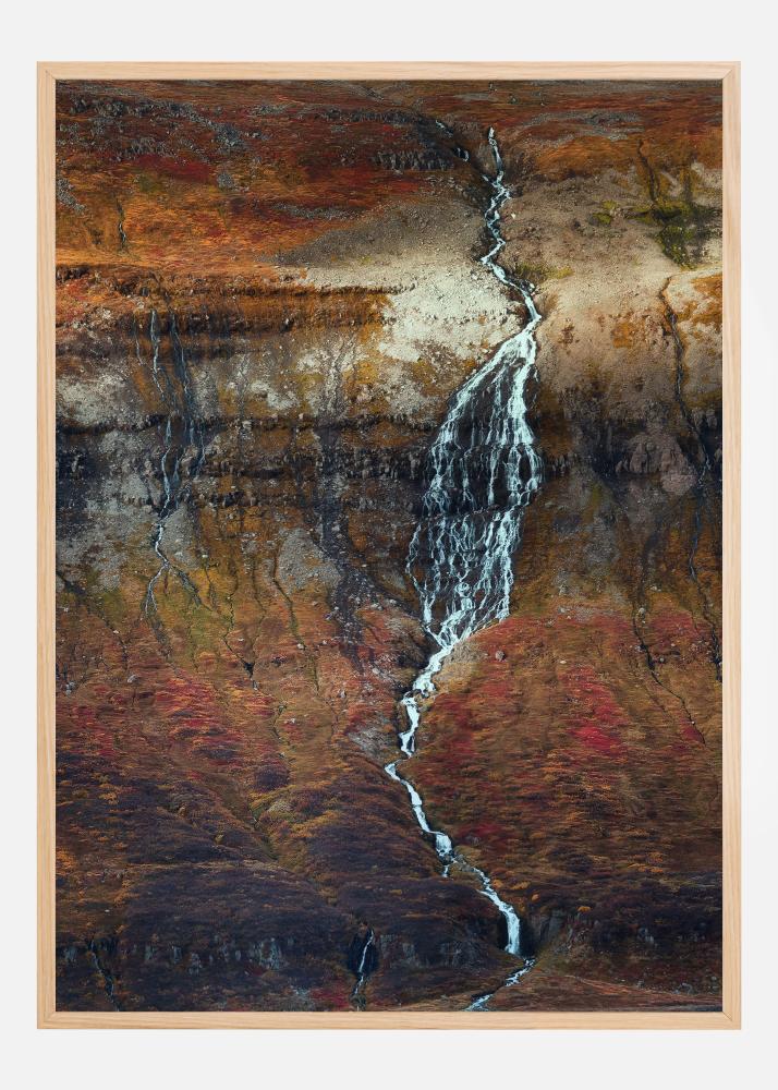 Čudovit naravni plakat z majhnim tekočim slapom čez mahom prekrite kamne. Rumene, rdeče in oranžne barve napolnijo sliko s toplimi toni, medtem ko svetlo beli potok kaskadira čez skale. Sledite gibom vode na tem fascinantnem plakatu, ko ga razstavite doma.