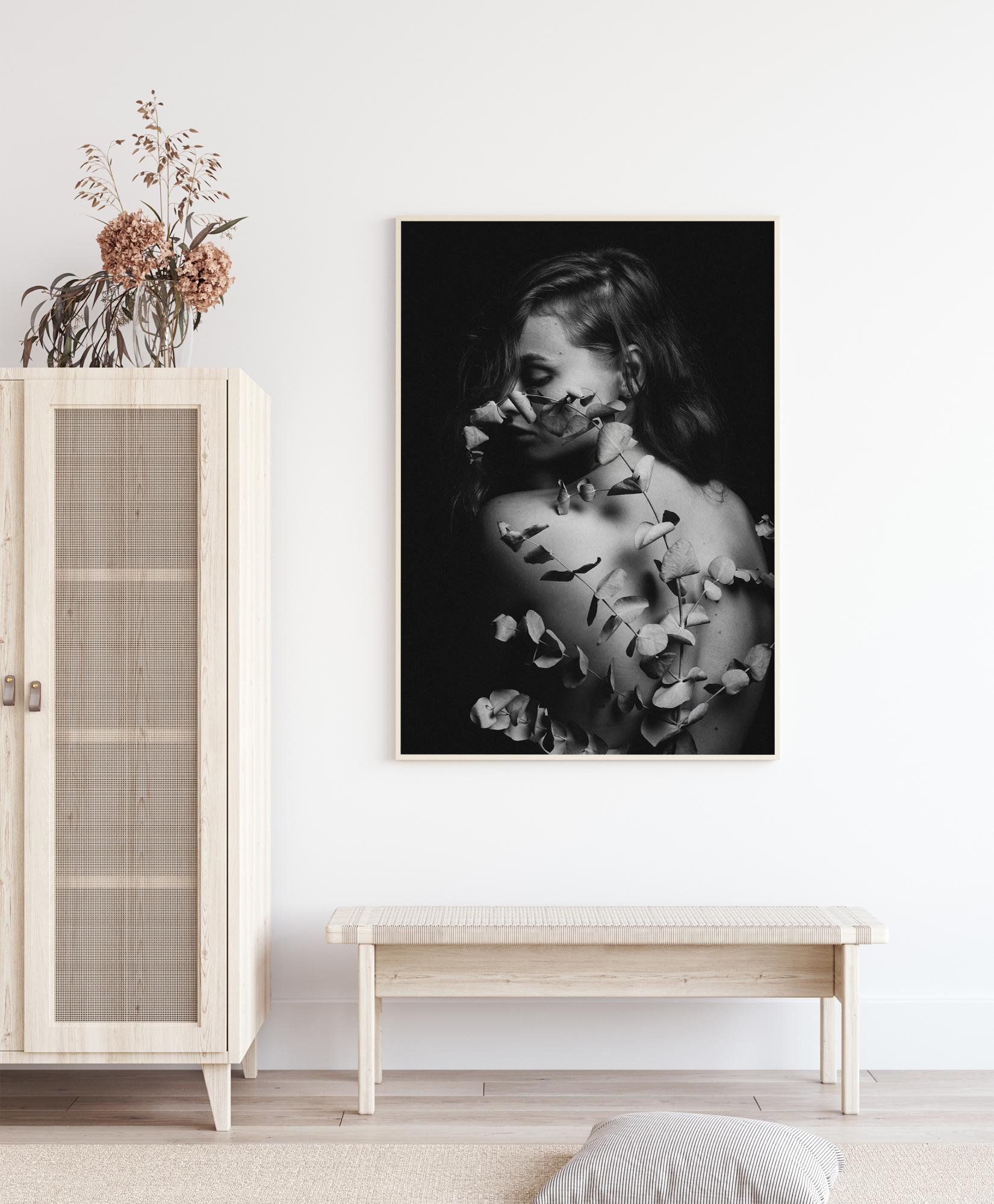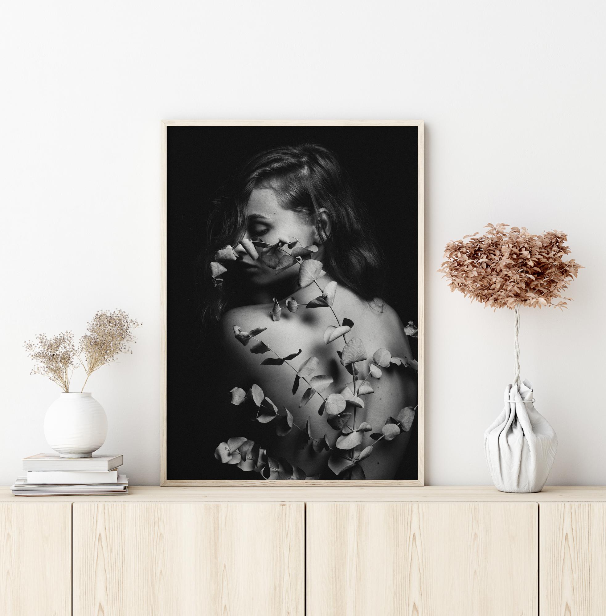 Lepa poster ženske z listi na hrbtu. Združite to črno-belo sliko z živahno barvo stene za dramatičen učinek. Občutite skrivnostnost in mir ter jih prinesite domov.