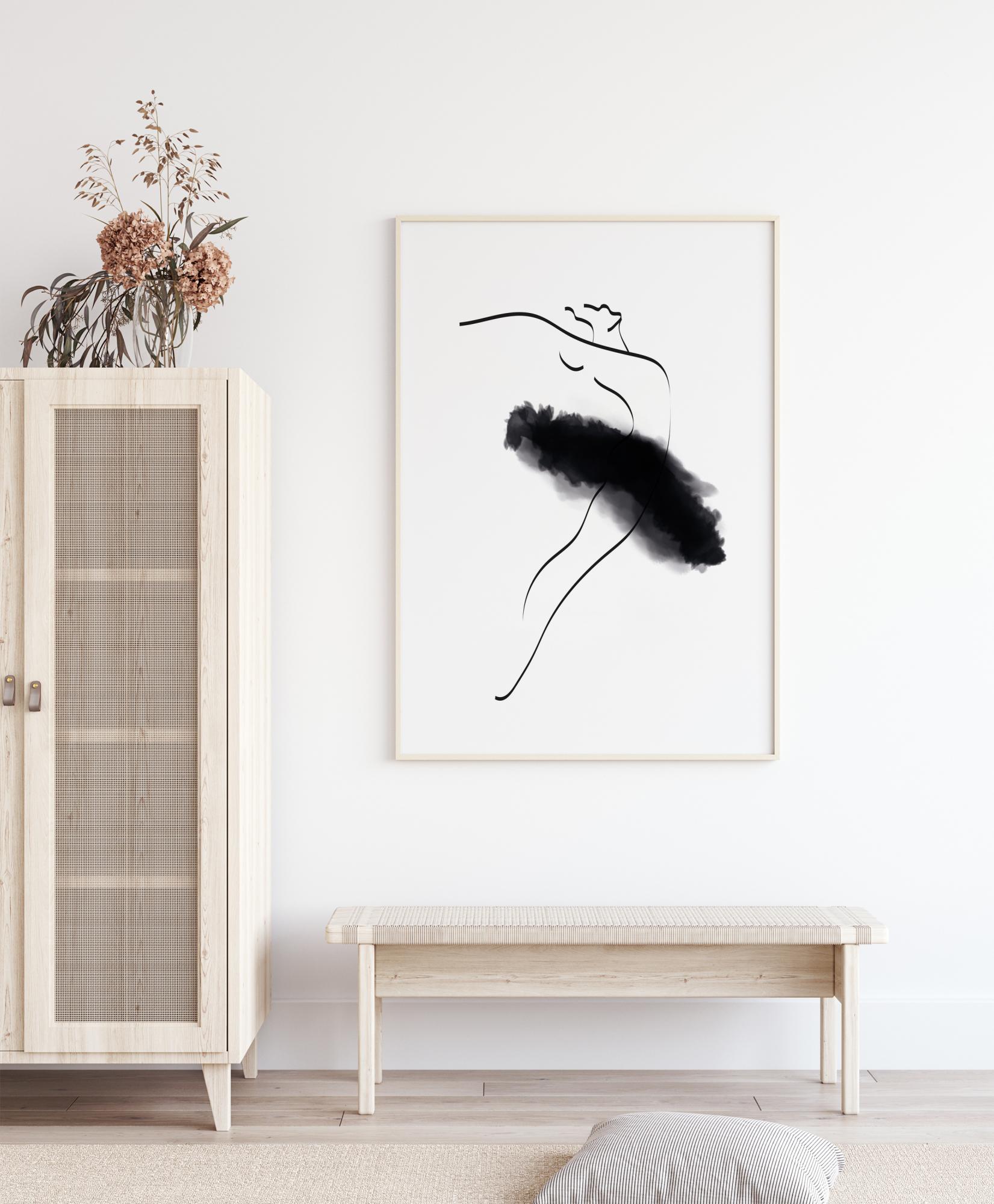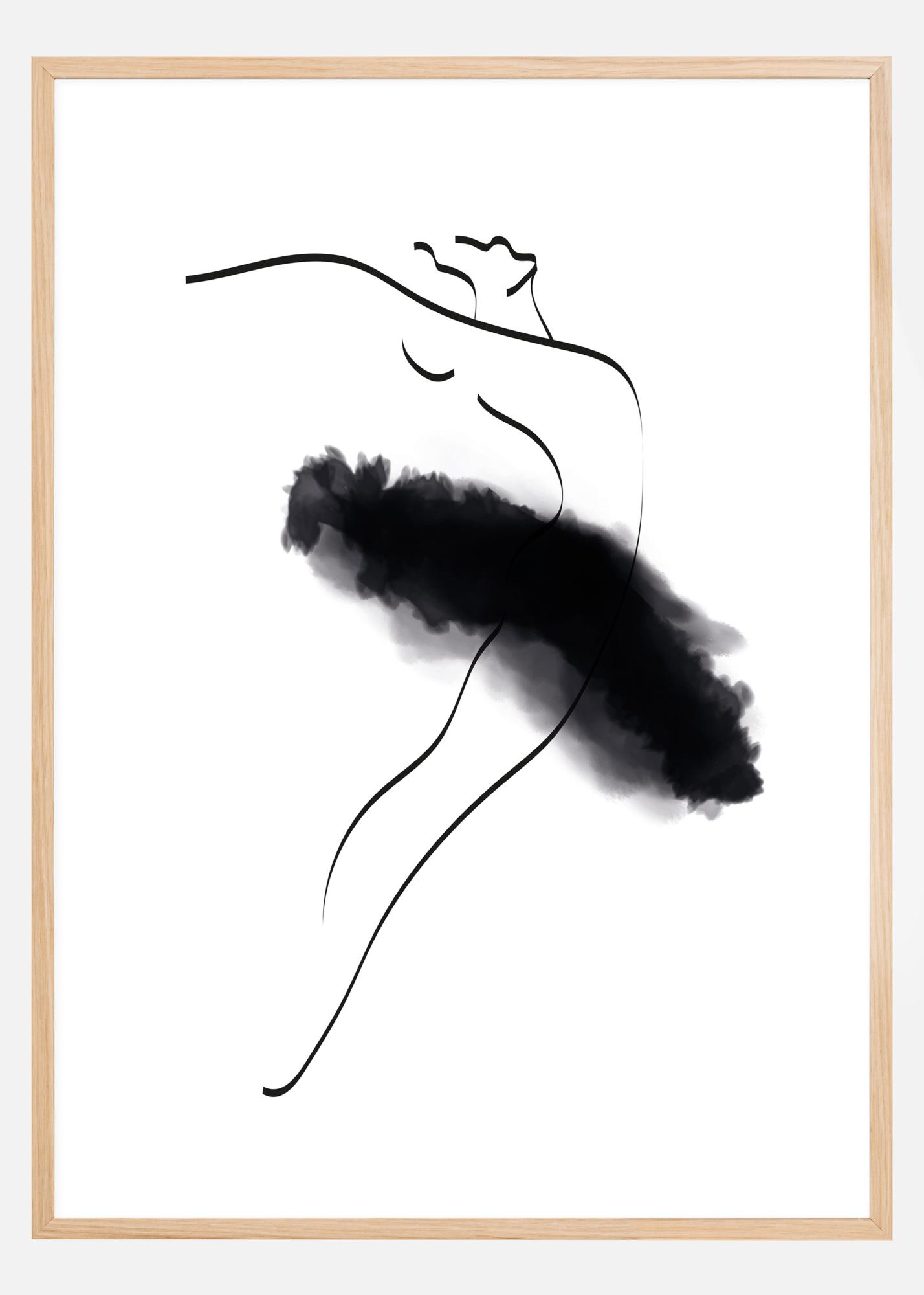 Akvarelna slika balerine v tankih črnih linijah z bolj izrazitim črnim baletnim krilom. Minimalističen in eleganten plakat, ki se enako lepo poda v spalnico ali hodnik, kot tudi v dnevno sobo ali knjižnico.