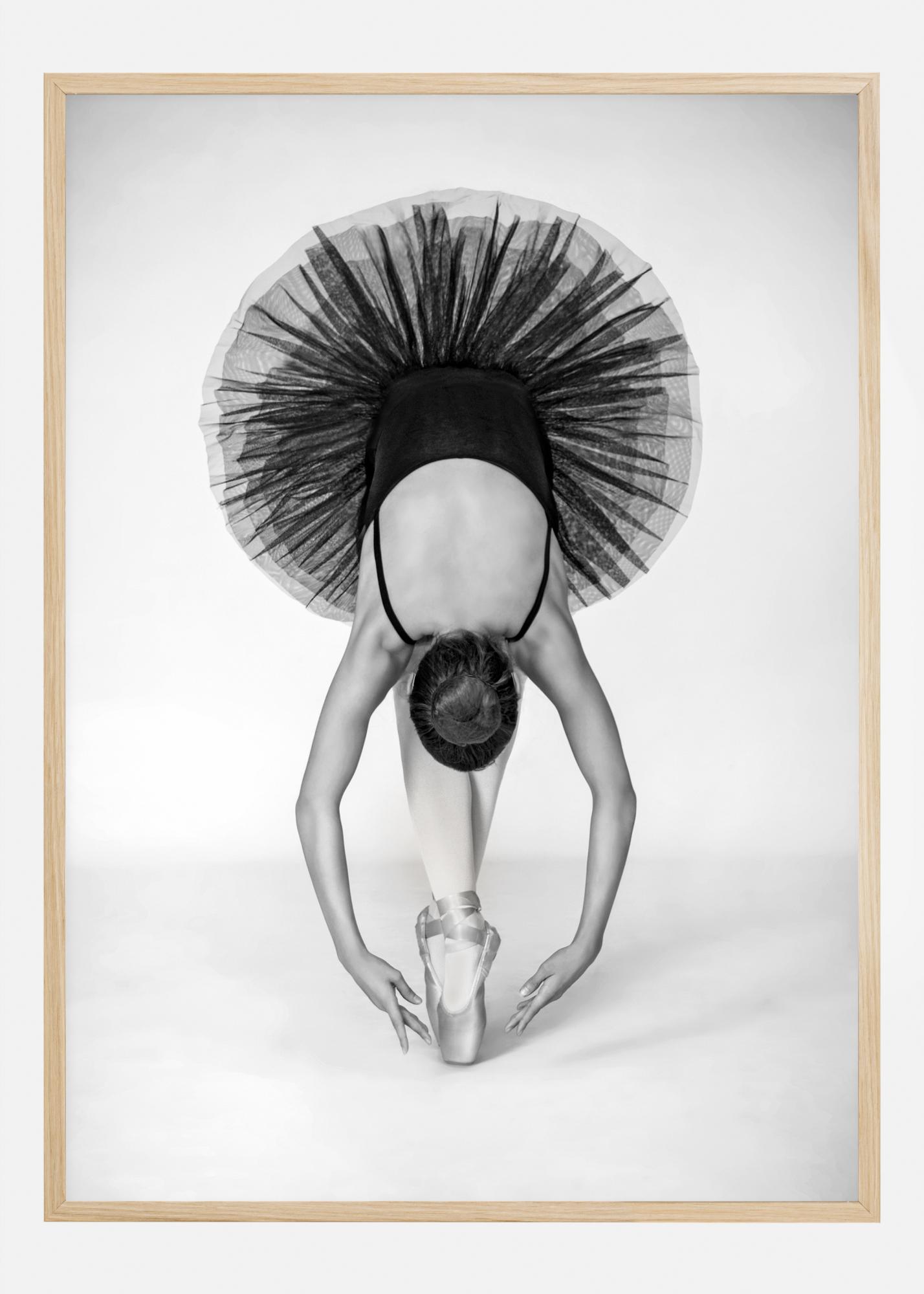 Plakat s portretom baletke. Ta baletka se sklanja naprej v petem položaju in ustvarja dva popolna kroga s svojimi rokami in črno tutu krilom. Črno-beli plakat jo poudari in ustvari eleganten, klasičen videz, ki polepša preprosto nevtralno steno kjerkoli v domu.