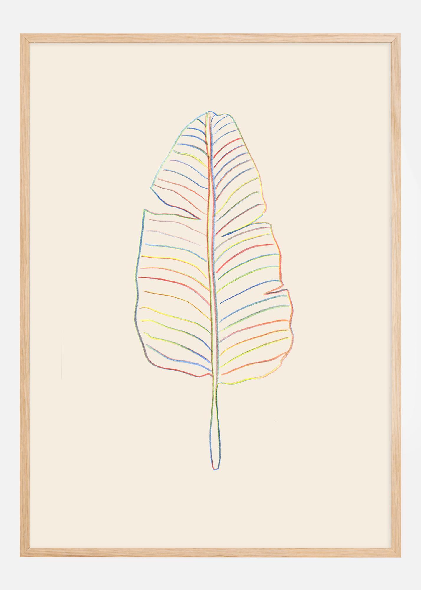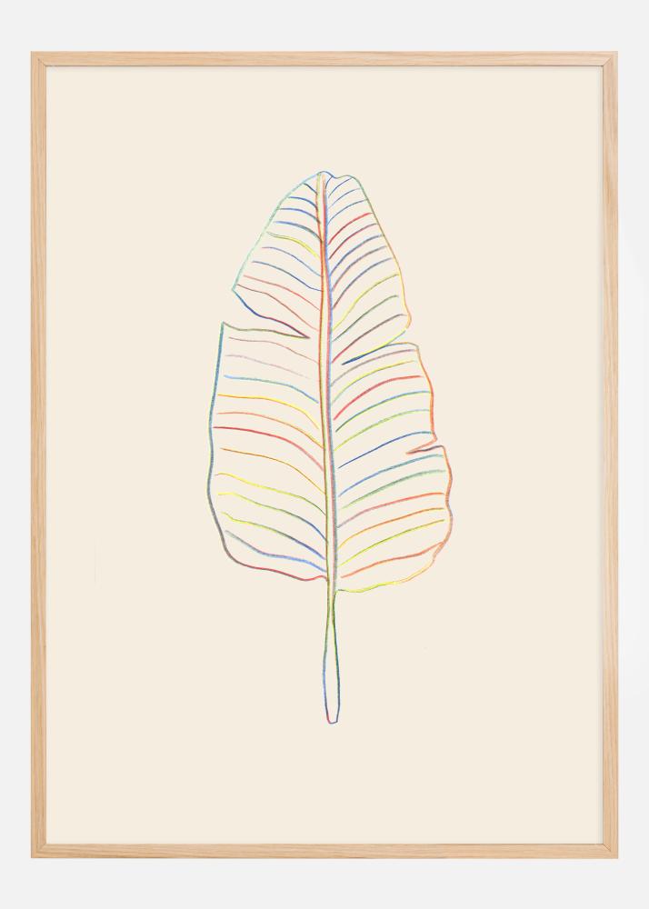 Ta živahen in barvit plakat prikazuje kreativno interpretacijo lista banane z linijami v spektru barv mavrice. Igrajoči kontrast med naravnimi oblikami lista in igrivimi barvami daje sodoben pridih klasični botanični umetnosti. Ta tisk je odlična predstavitev, kako klasične motive lahko preoblikujemo z dodano barvitostjo, da se prilegajo sodobni estetiki.