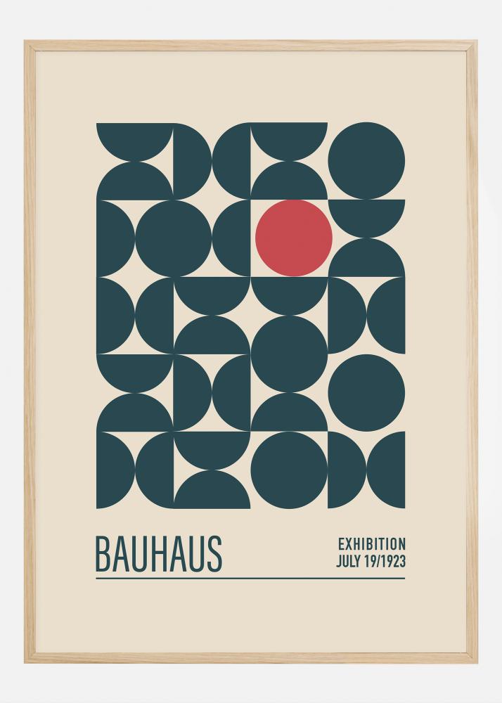 Ta plakat zajema minimalistično bistvo Bauhaus gibanja in njegov poudarek na geometriji in barvi. Grafična kompozicija je sestavljena iz prekrivajočih se krogov v različnih odtenkih modre barve z rdečim poudarkom, ki ustvarja dinamično in vendar uravnoteženo vizualno izkušnjo. Besedilo "BAUHAUS EXHIBITION JULY 19/1923" se nanaša na razstave zgodovinske oblikovalske šole, ki so bile pionirji sodobnega oblikovanja.
