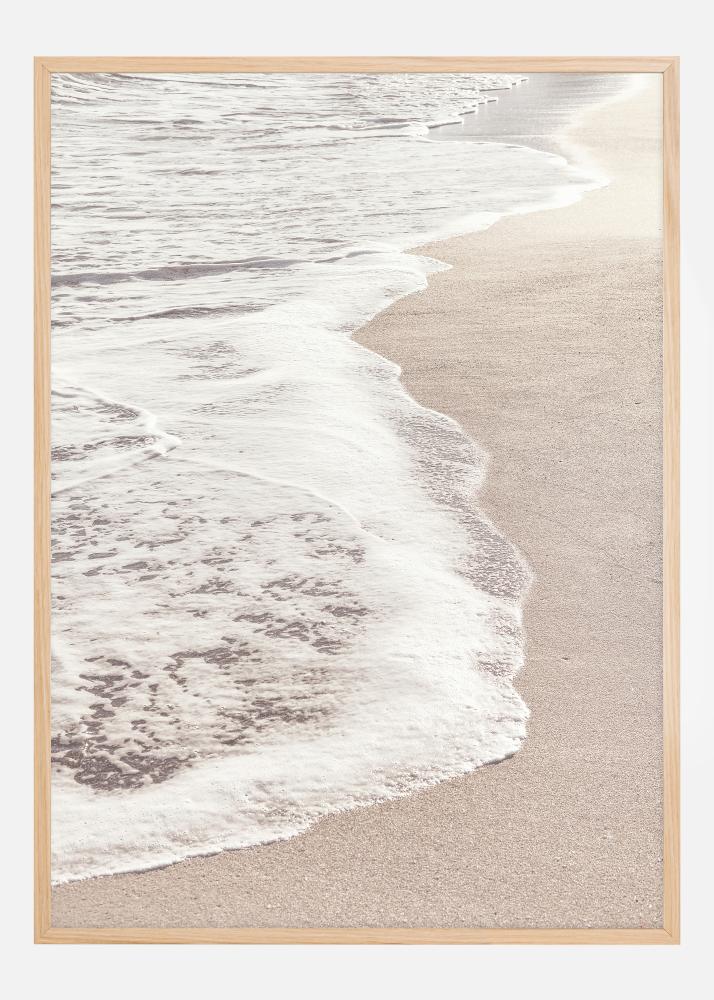 Ta razgibana plakat prikazuje miren ritem morskih valov, ki počasi prihajajo na zlato peščeno plažo. Harmoničen prehod iz vode na kopno ujame večen cikel morja in tiho lepoto preprostega krajinskega obalnega območja. Mehke, nevtralne barve plakata in nežni vzorci pene na pesku prenašajo občutek miru in brezčasne povezave z naravo.