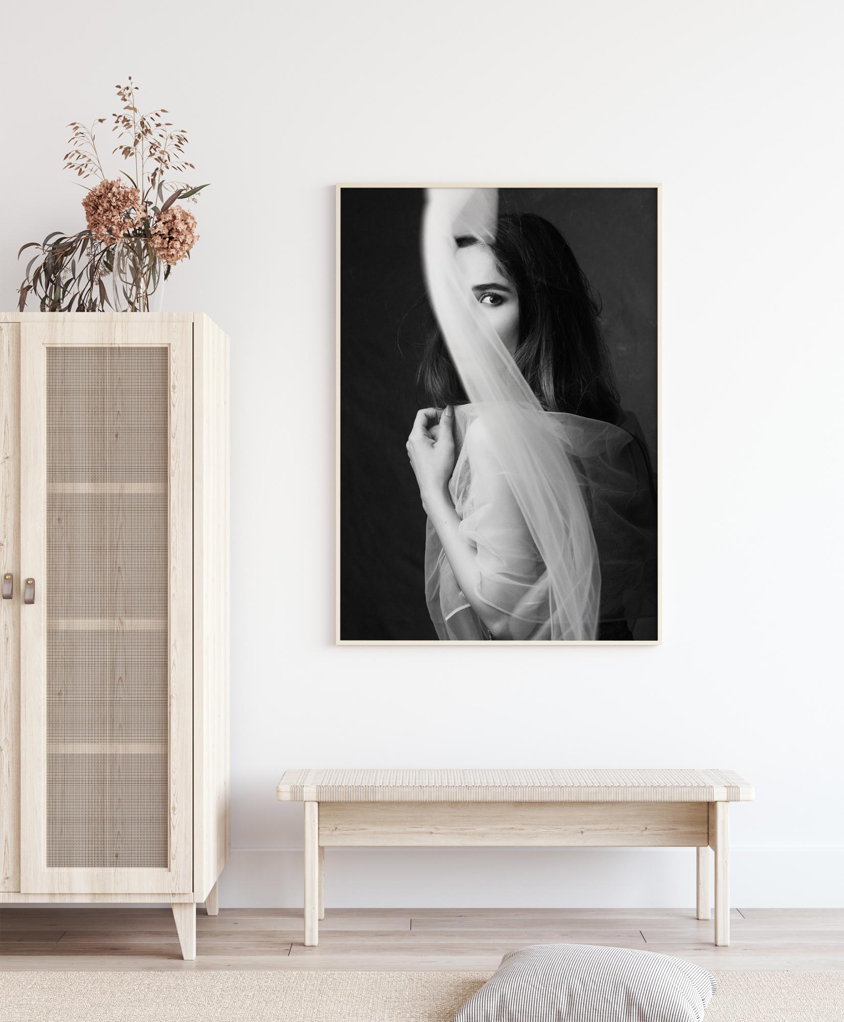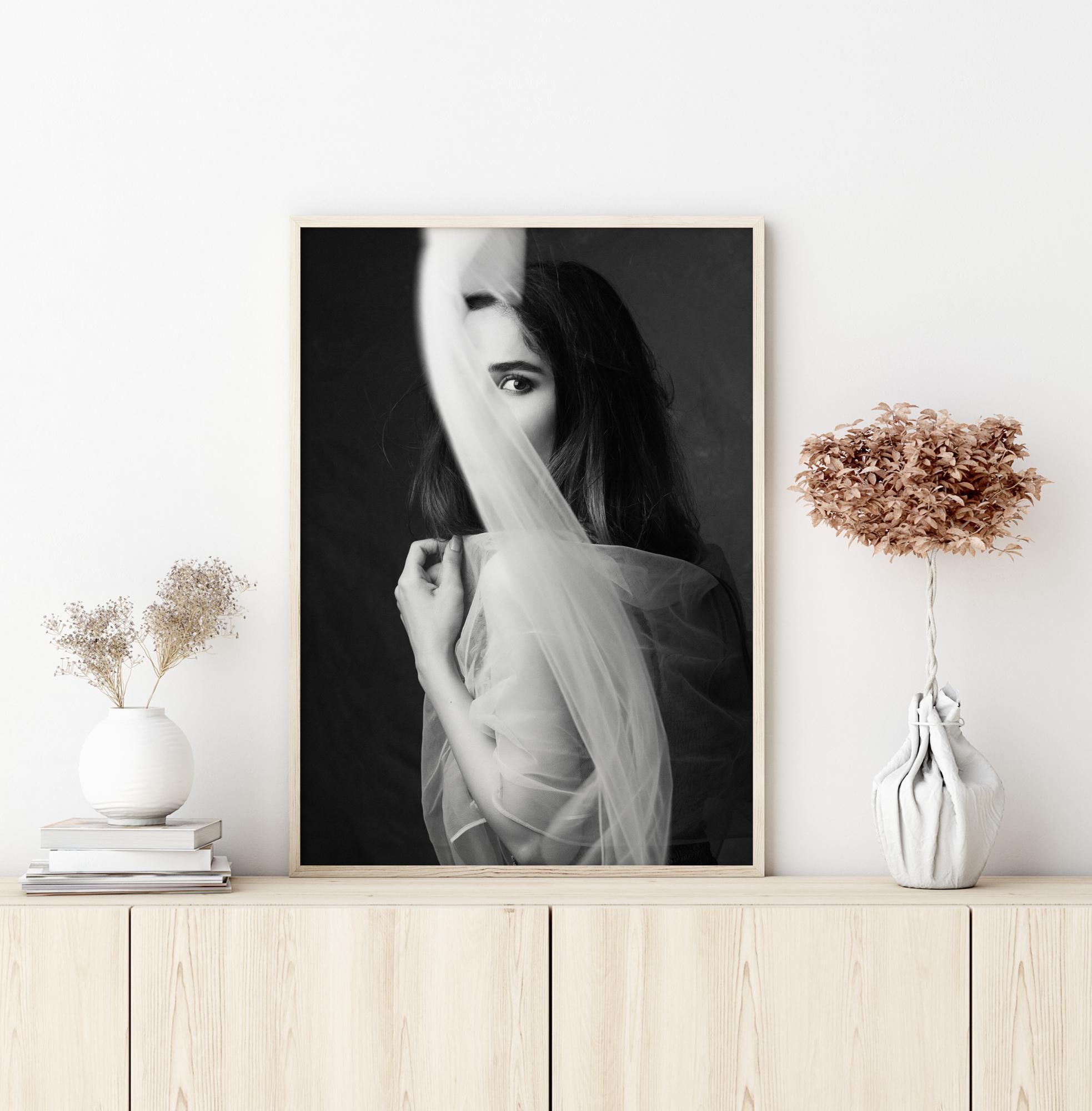 Čutna fotografija ženske, ki se skriva za zaveso. Mehko zavijanje zavese pritegne pogled na ženski obraz. Ta plakat vas popelje na miren kraj, kjer se lahko povežete.