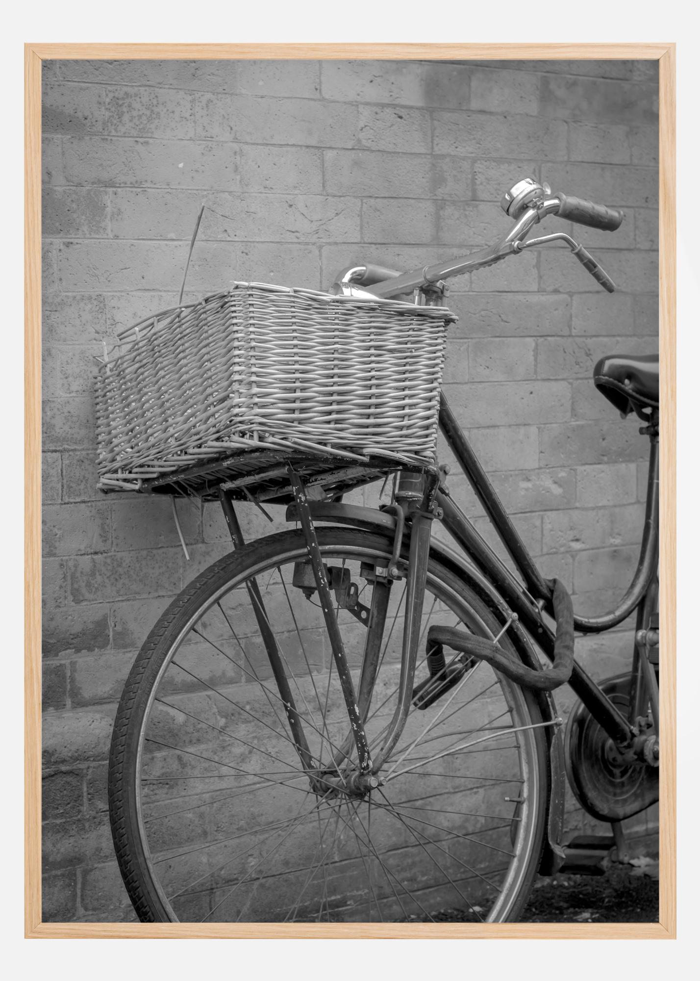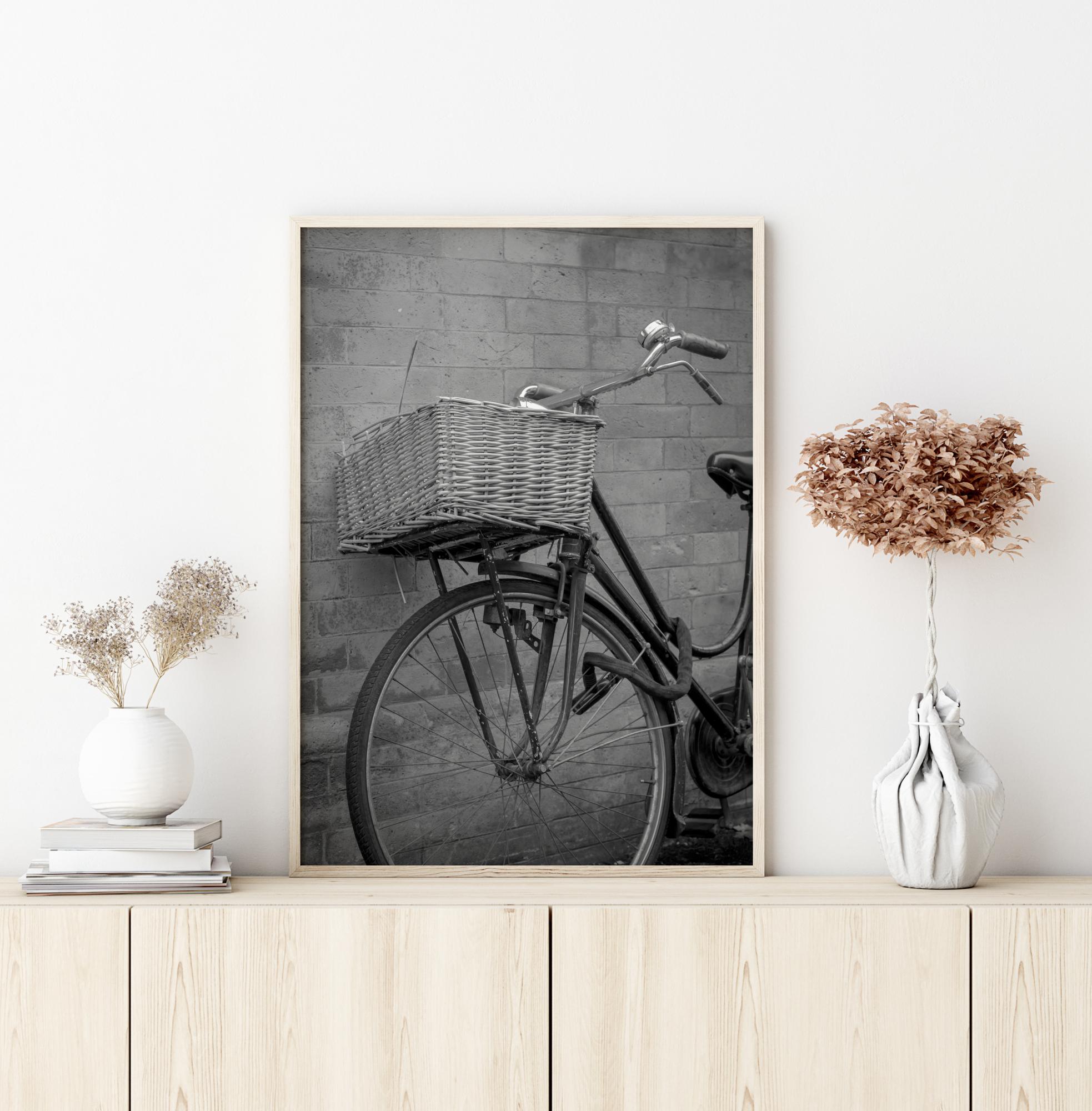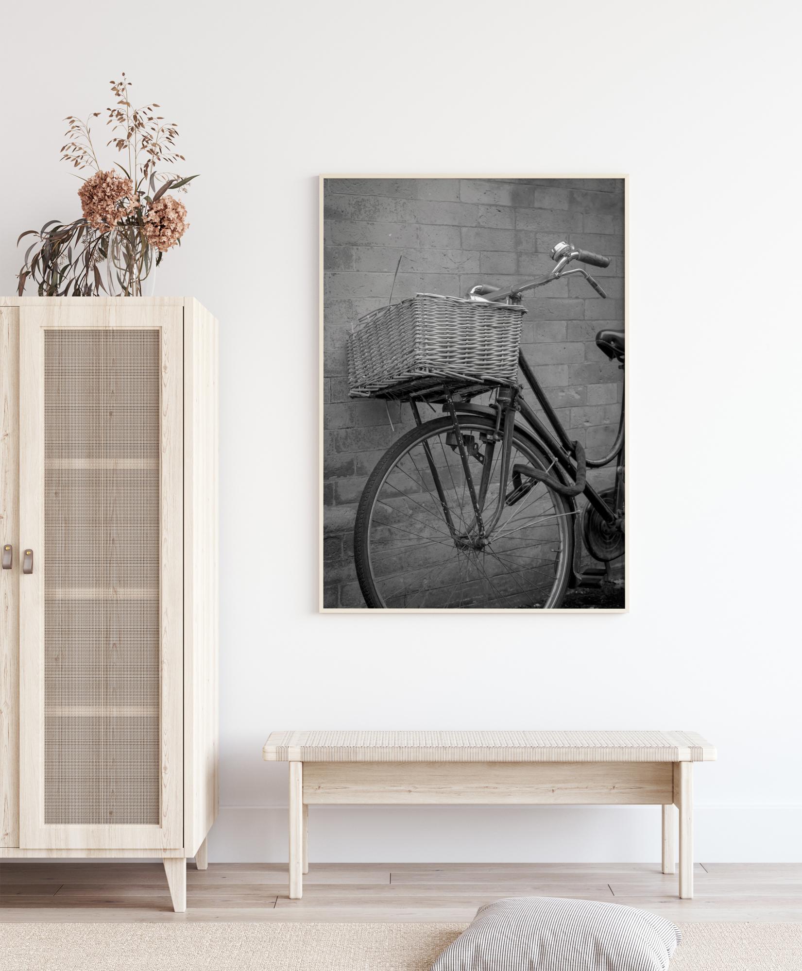 Tihožitje plakat s kolesom, naslonjenim na opečnato steno. Košara za kolo je v ospredju, kontrastni črni okvir in ključavnica za kolo pa vodita pogled okoli plakata. Obešanje te preproste, vendar elegantne slike na svetlo steno bo dalo prefinjen učinek.