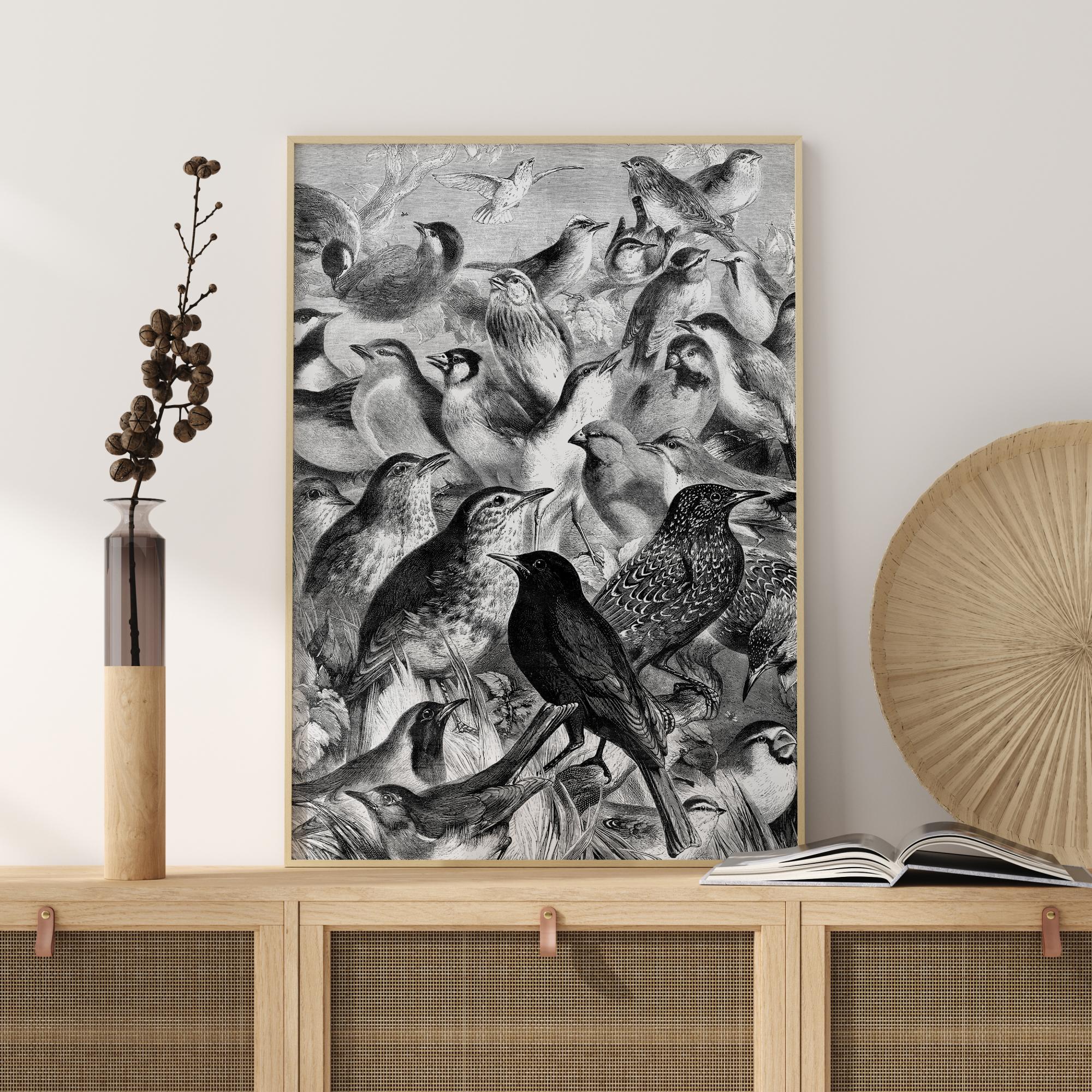 Črno-beli plakat z različnimi pticami. Spoznajte vse o pticah s pomočjo tega tiska z različnimi britanskimi pticami. Bodite zaposleni, medtem ko odkrivate ptice na sliki in se učite nekaj o njih. Naj še bolj izstopajo tako, da sliko obesite na svetlo obarvano steno.