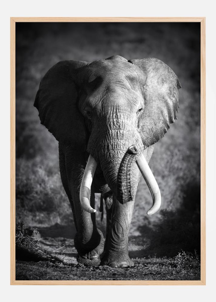 Ta črno-beli tisk ni le upodobitev največje kopenske živali sveta, temveč tudi poklon veličini naravnega sveta. Kontrast med dramatično teksturo slona in mehkim ozadjem omogoča, da ta plakat preprosto postane središčna točka v vsakem prostoru, hkrati pa je subtilen opomnik na fascinanten divji svet našega planeta.