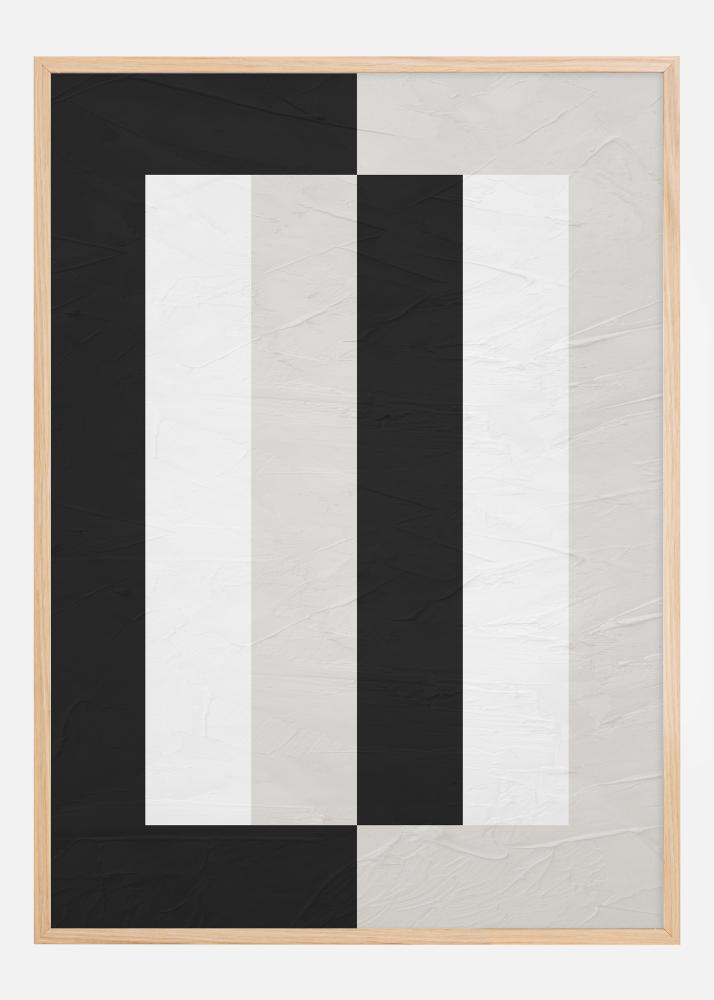 Ta prefinjena plakat prikazuje drzno in grafično kompozicijo, ki takoj pritegne pozornost opazovalca. Kontrastna kombinacija črne in bele barve oblikuje serijo vertikalnih linij in blokov, kar ustvarja optično iluzijo globine in gibanja. Ta plakat je idealen za sodobnega notranjega oblikovalca, ki išče izjavljalno umetniško delo, ki prenaša občutek elegance in sodobnega oblikovanja. Stroga barvna paleta omogoča enostavno vključitev te slike v različne prostore in okolja.