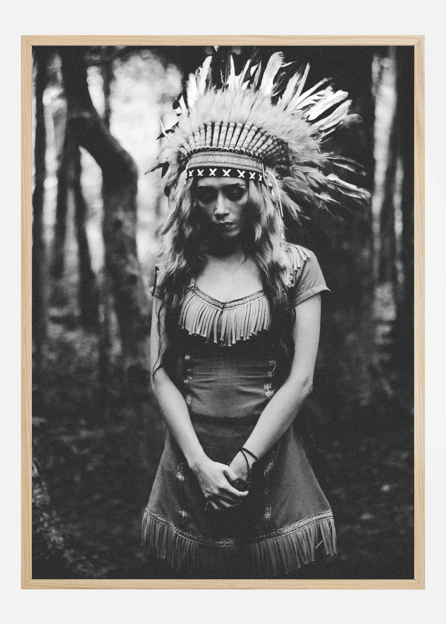 Portretni plakat z indijansko deklico v gozdu. Ta močna črno-bela slika omogoča, da bele perje na naglavnem okrasju izstopajo proti temnemu drevesnemu deblu. Dovolite si doživeti premišljujoč trenutek, ko spusti pogled proti svojim sklenjenim rokam.
